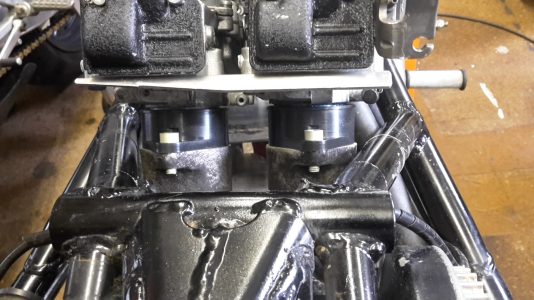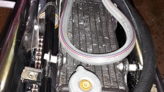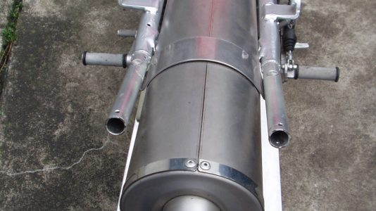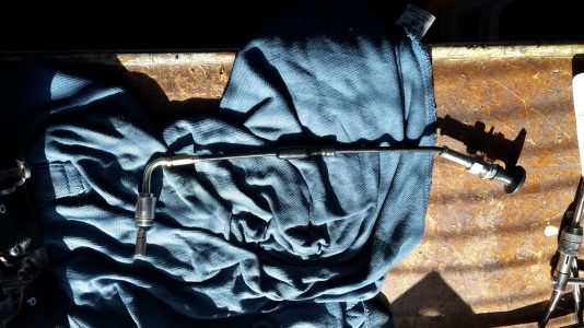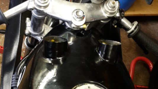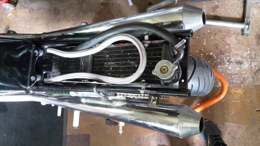 Die "Restaurierung" einer Saturno mit einer selbst gefertigter Doppelauspuffanlage erfordert die Anfertigung eines speziellen Kupplungszugs mit winkliger Verlegung. Bei "normaler" Verlegung würde der Bowdenzug sofort mit dem Krümmer "verschmelzen". Ich habe mir daher aus 3 Einzelteilen ein Krümmerstück angefertigt um den Bowdenzug vom Krümmer weg zunächst nach unten führen zu können.
