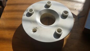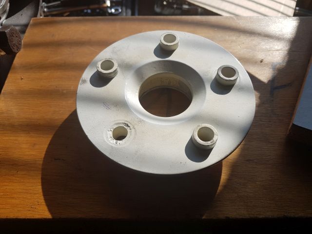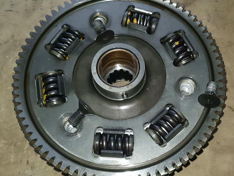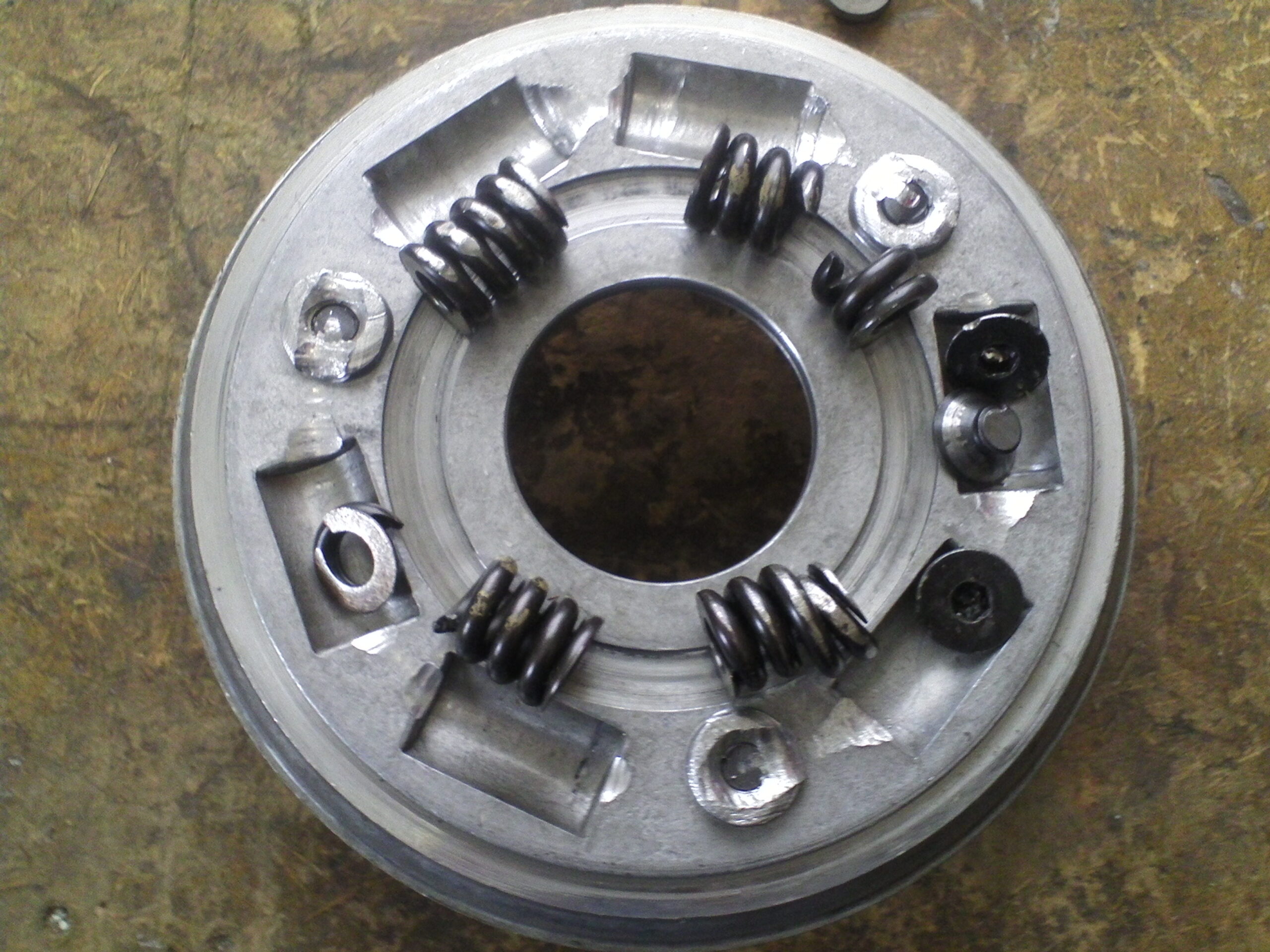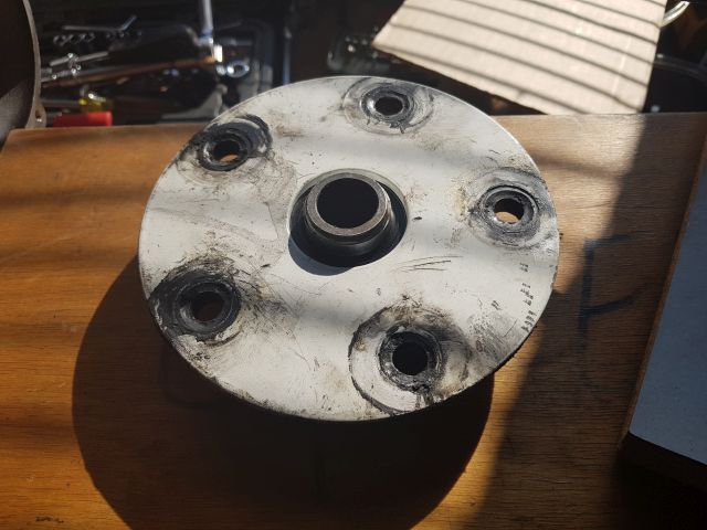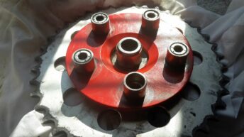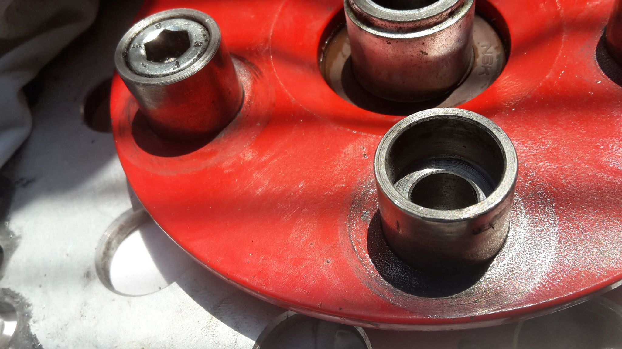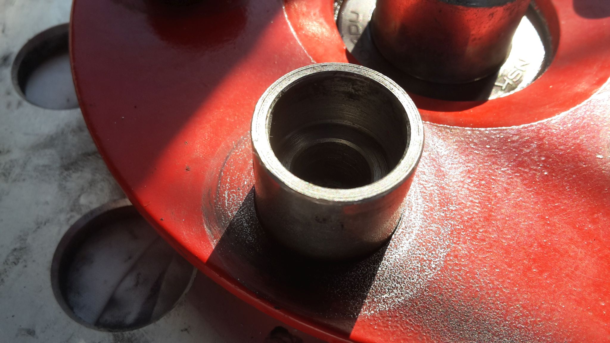 Gilera Saturno: Umbau Ritzelträger. Schon vor Jahren nervte mich das leichte, radiale Spiel zwischen Ritzelträger und Hinterrad. Grund dafür ist die m. E. Fehlkonstruktion des Ritzelträgers, bei dem über den Schraubenköpfen eine Hülse (die hat immer Spiel) geschoben wird, die dann als Aufnahme der Anruckgummis fungiert. Schlimmstenfalls brechen durch die Wechselbelastung die kleinen Erhebungen ab, die die Hülsen führen sollen. Ich habe daher mehrere Ritzelträger umbauen lassen. Es wurden aus hochfestem Stahl Hülsen mit "Hals" angefertigt, die in den Ritzelträger verpresst wurden. Jetzt übernimmt die Schraube wirklich nur die Funktion der Kettenblattbefestigung und die eingepressten Hülsen die Radialkräfte beim Beschleunigen bzw. Abbremsen