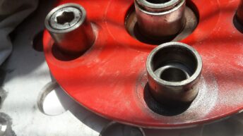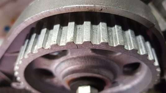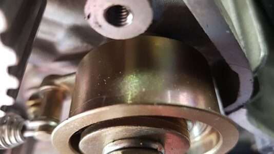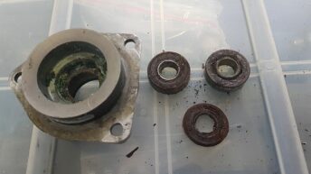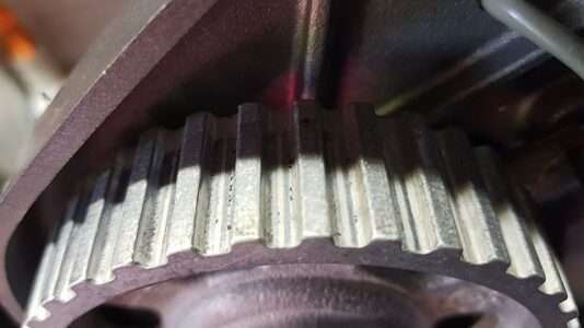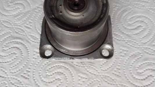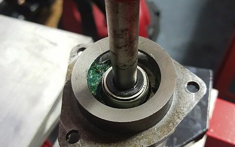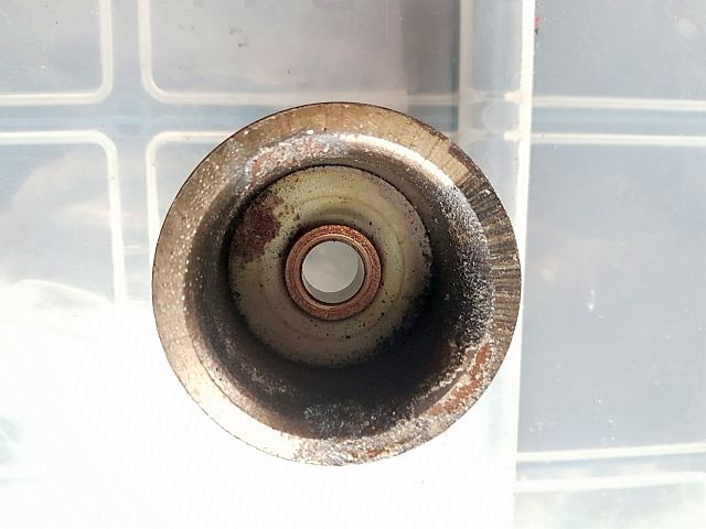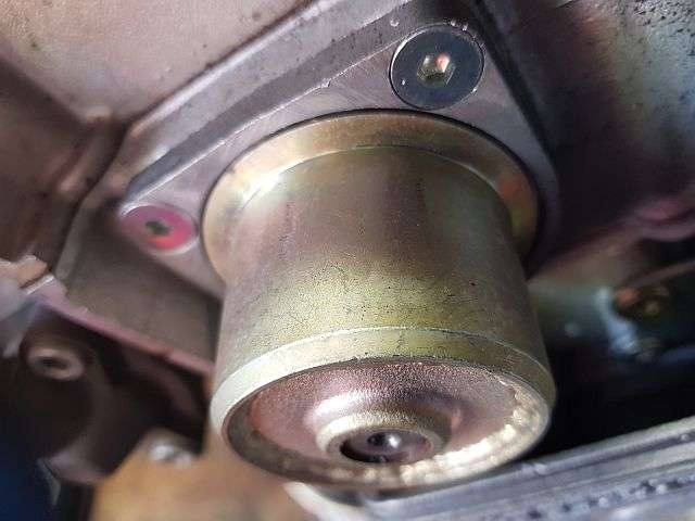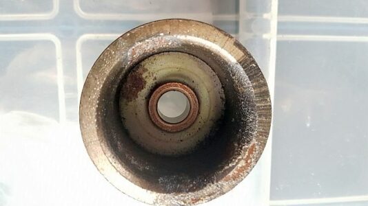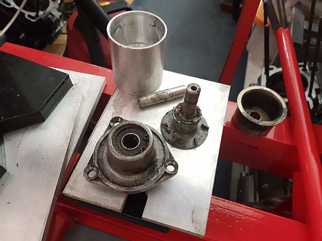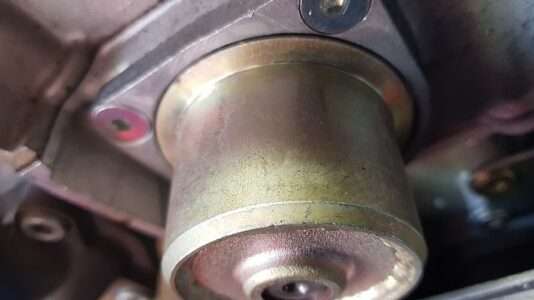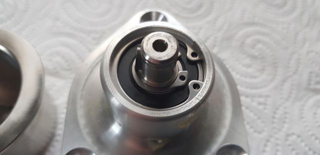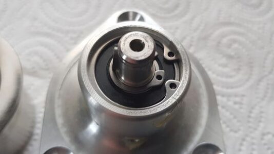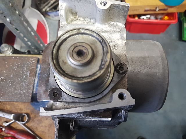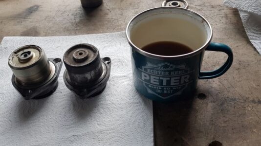 Ich beginne mit der Antriebsrolle. Warum? Die beiden kleinen Kugellager sind Pfennigartikel und sollten sowieso erneuert werden. Aber auf diese Weise bleibt die Achse mit Flügelrad und Gleitringdichtung als Einheit erhalten. Ich habe schon Pumpen zerlegt, da hatten die Lager etwas Spiel, möglicherweise durch eine zu stramme Einstellung des Zahnriemens. Der Rest dieser Pumpe war aber noch in Ordnung. Aber die Entscheidung, was erneuert werden sollte, muss individuell getroffen werden
