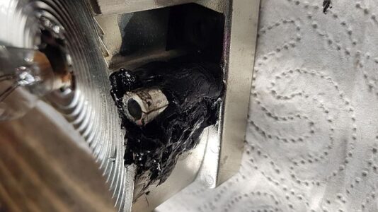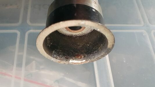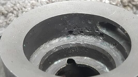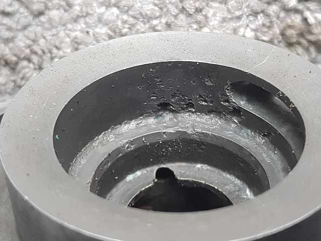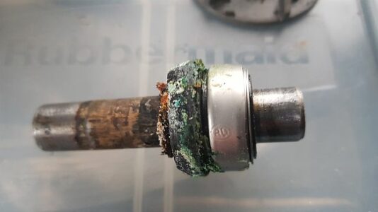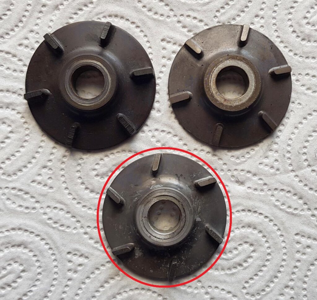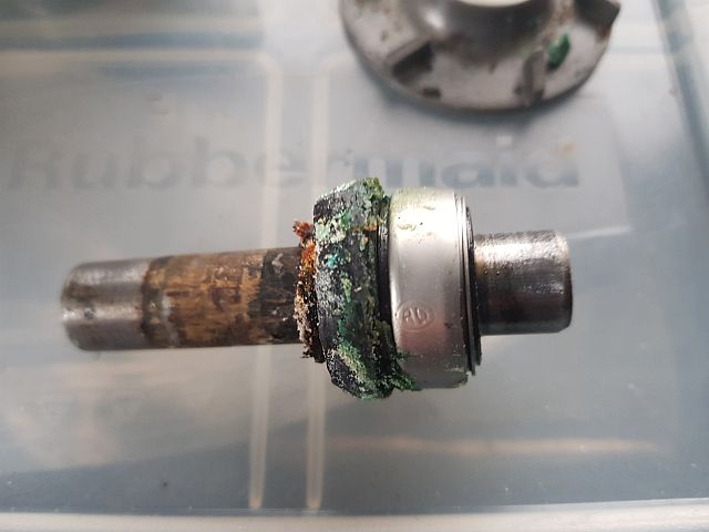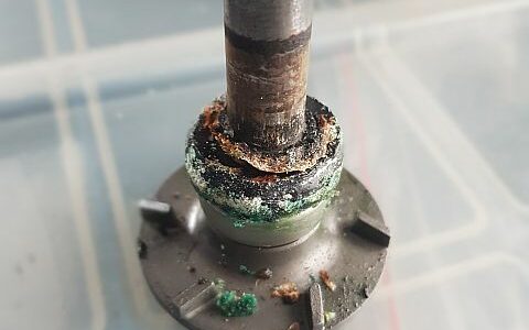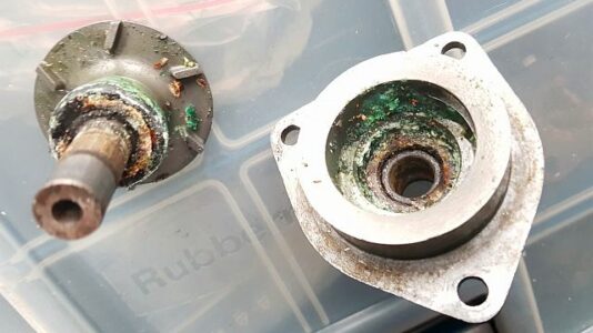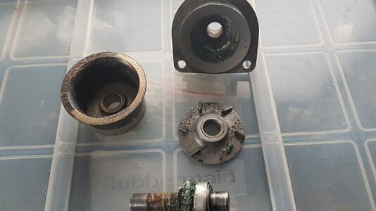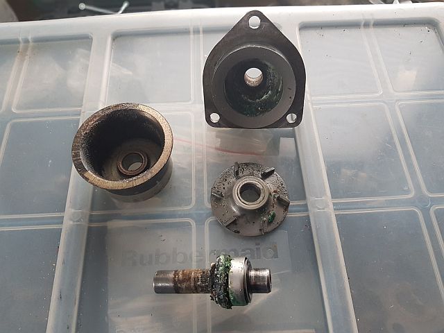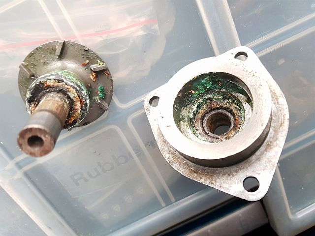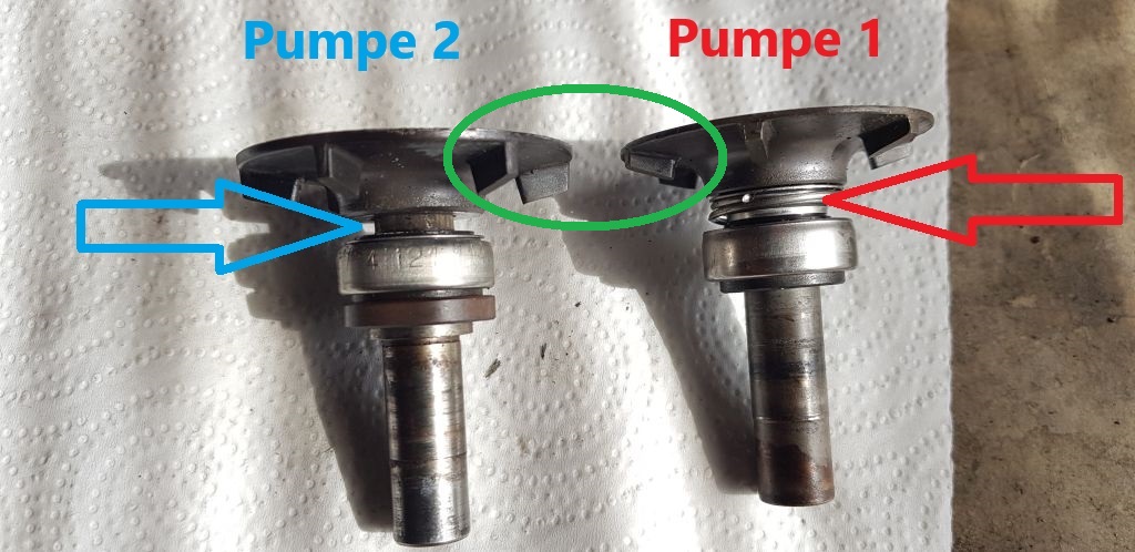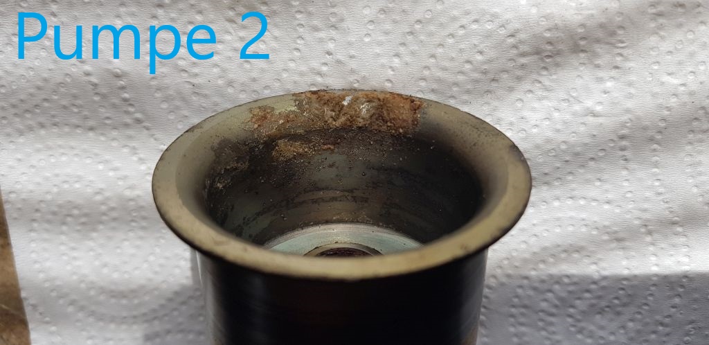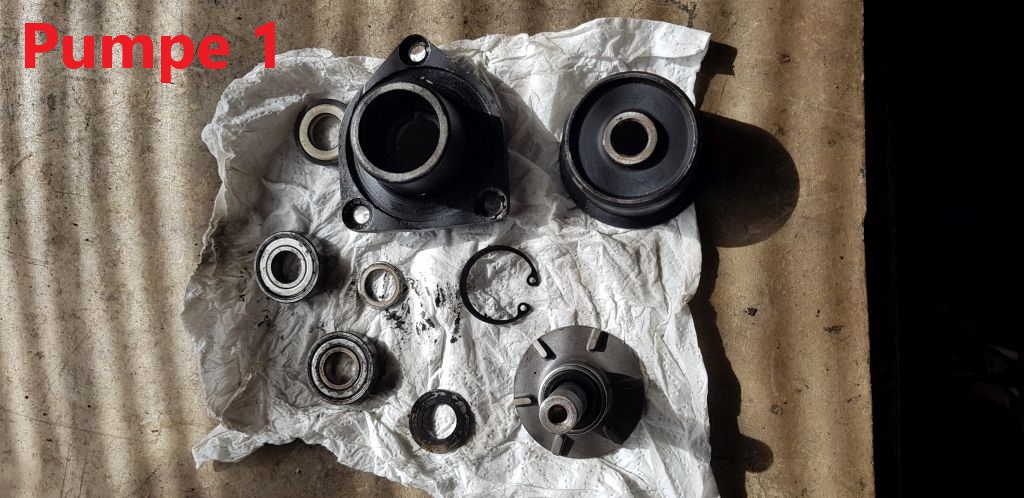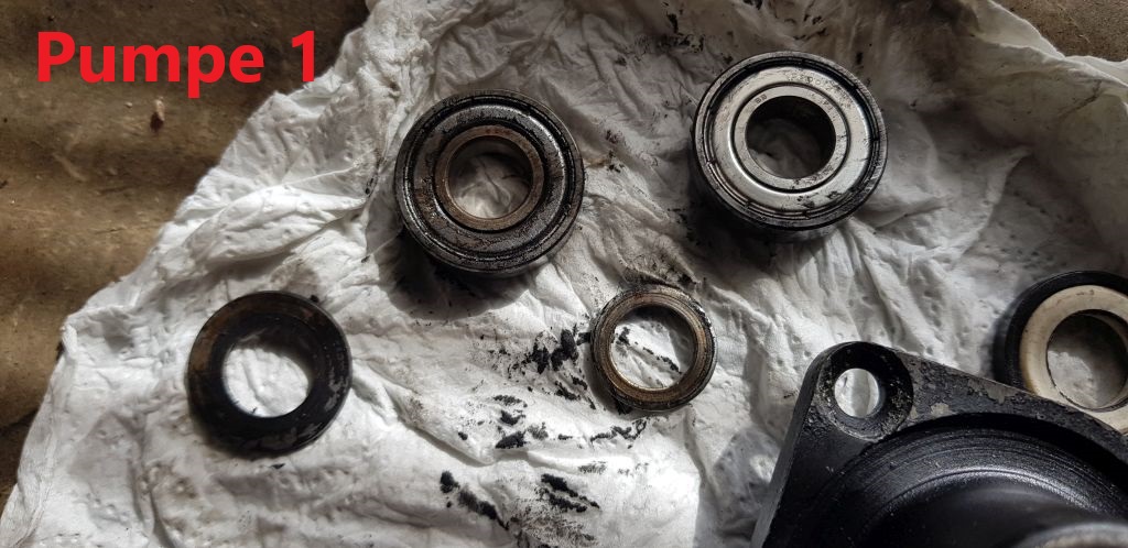 Zur Pumpe 2: Hier fiel die fehlende Zentrierbohrung in der Welle auf. Dies ließ ganz klar auf schon mindest eine erfolgte Zerlegung und Erneuerung der Welle hin. Die Ablagerung an einer Stelle im Laufrad lässt auf einen langen Stillstand, einschl. undichter GRD, vermuten. Tatsächlich ist auch eine völlig falsche GRD verbaut (ohne Andrückfeder). Das konnte so nicht funktionieren. Zwar sind RS Lager verbaut, aber die hakeln auch schon beim leichten Drehen unter Druck. Desweiten waren an beiden Pumpen unterschiedliche Flügelräder verbaut. Grund? Schätzung der Kosten einer Überholung: GRD 35 €, 2 neue Lager 10 €. Dies alles ohne Gewähr