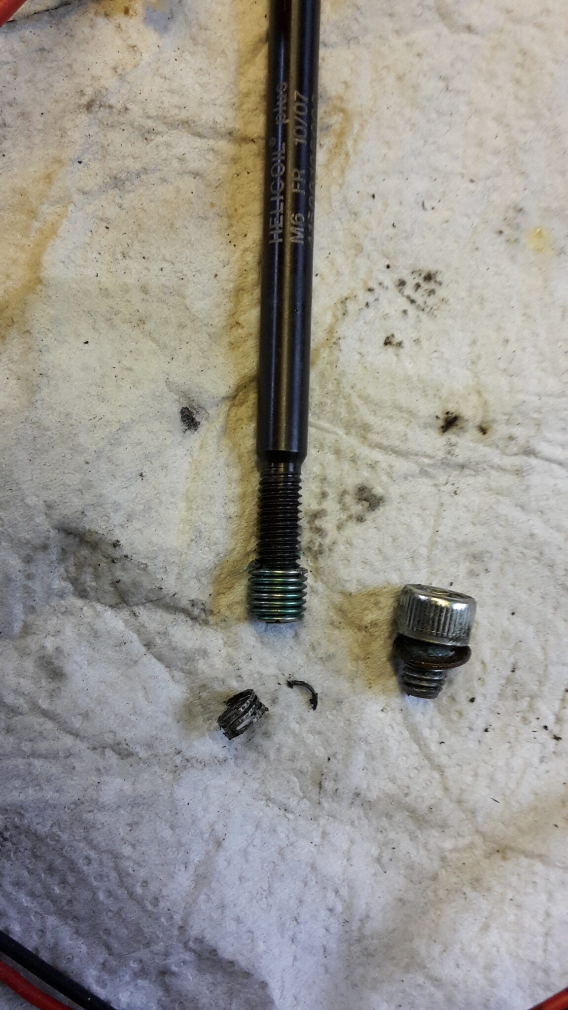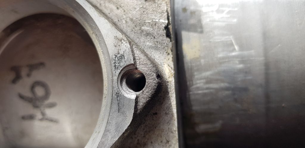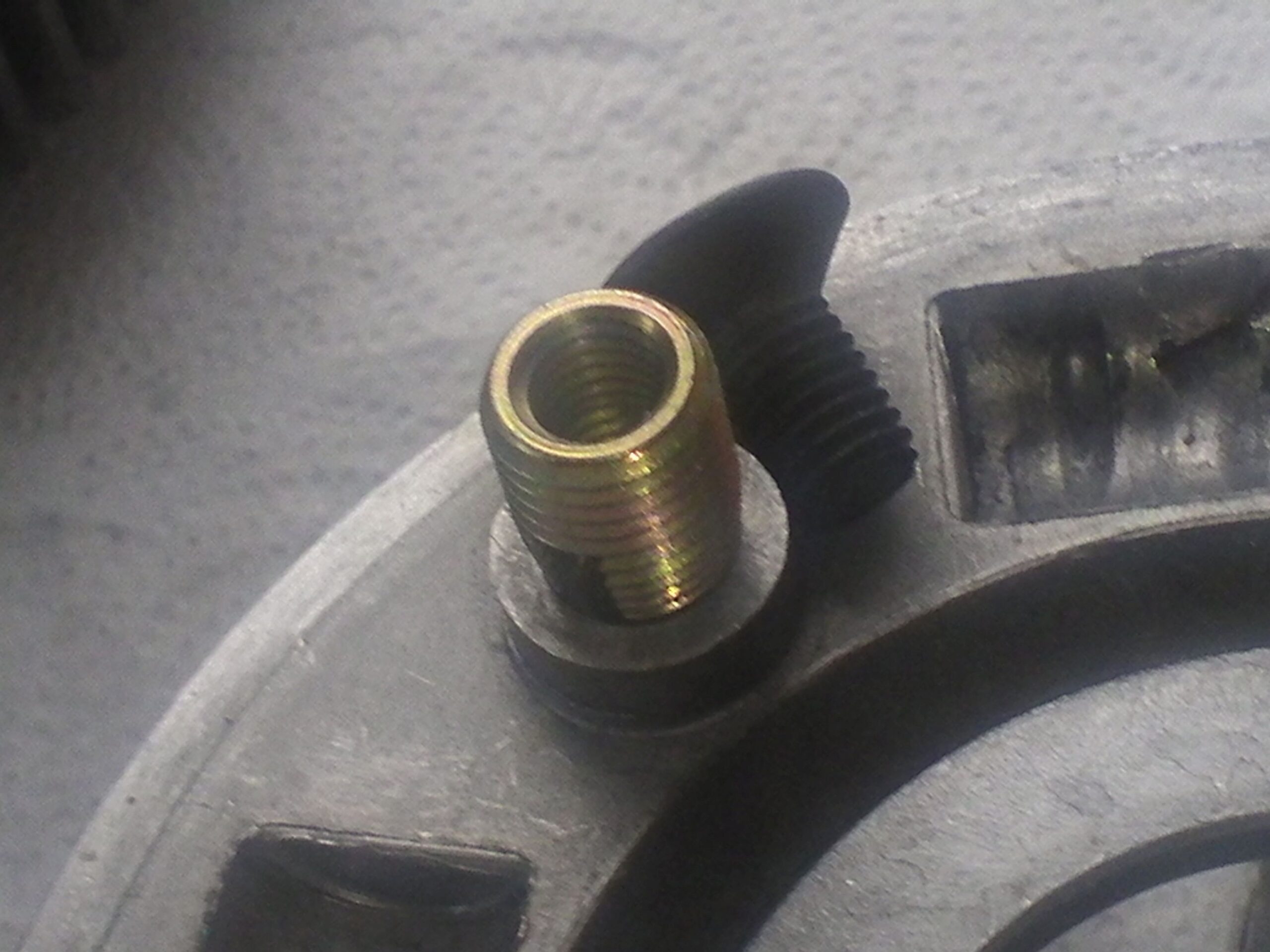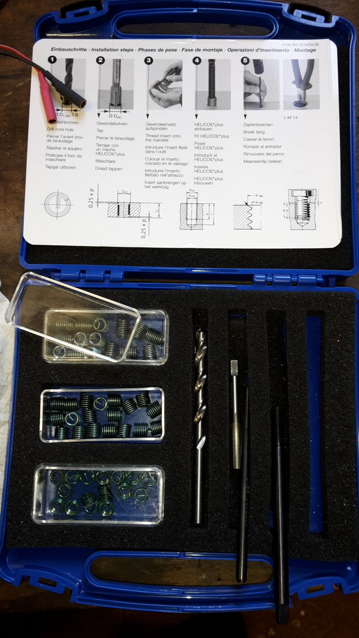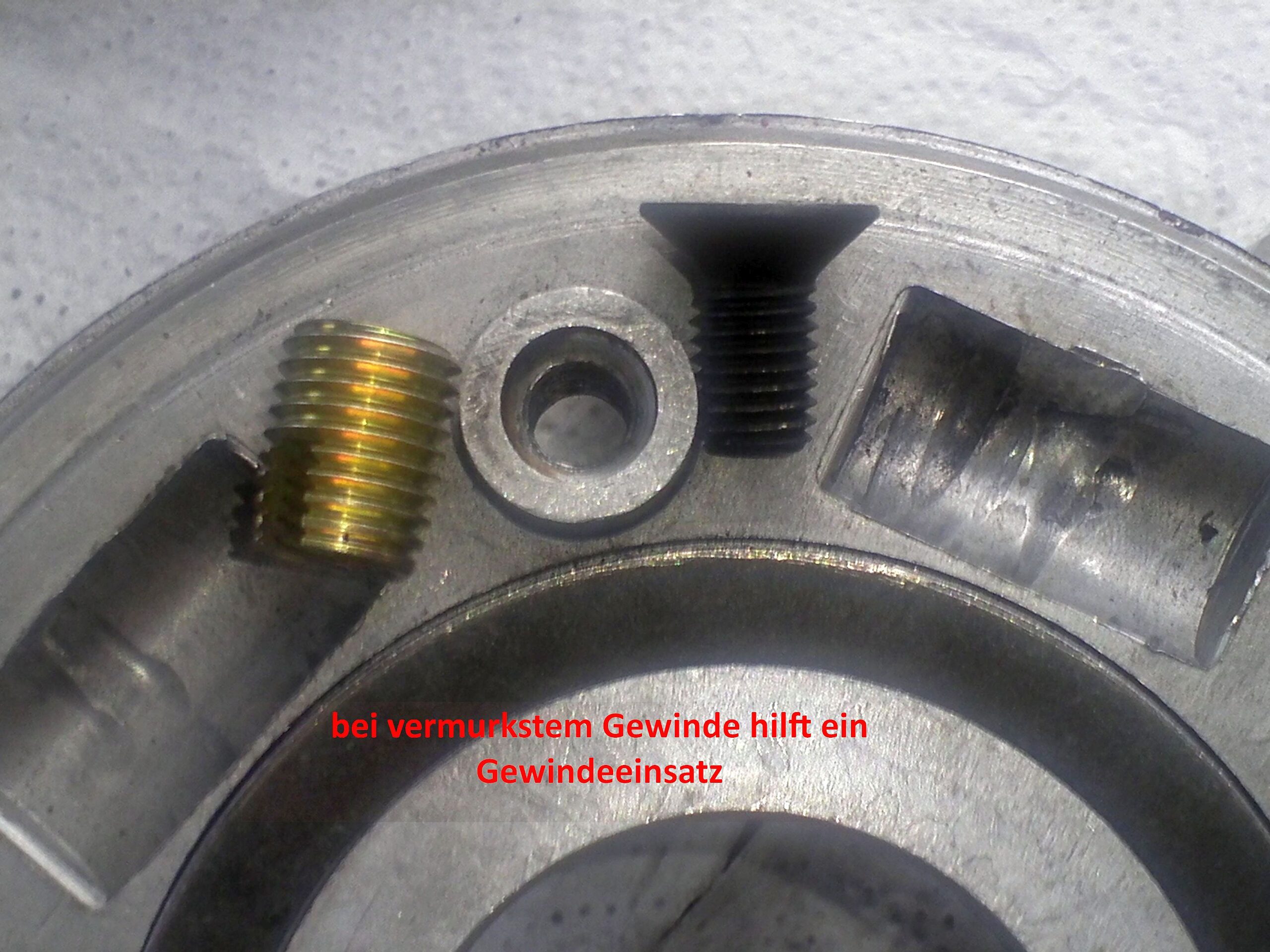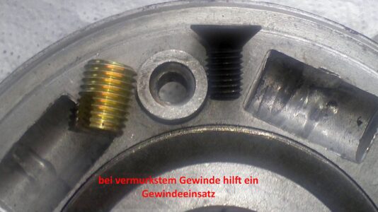 Am gleichen Motor wie beim vorherigen Beitrag habe ich nach dem Entlüften, beim Anziehen der M6, das Gewinde herausgerissen, shit happens. Schnelle Reparatur mit einem Gewindeeinsatz