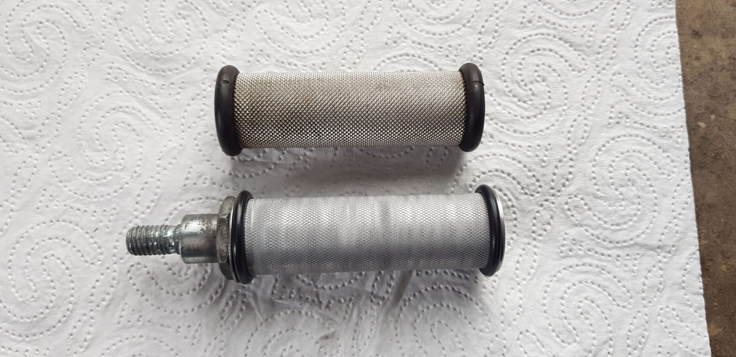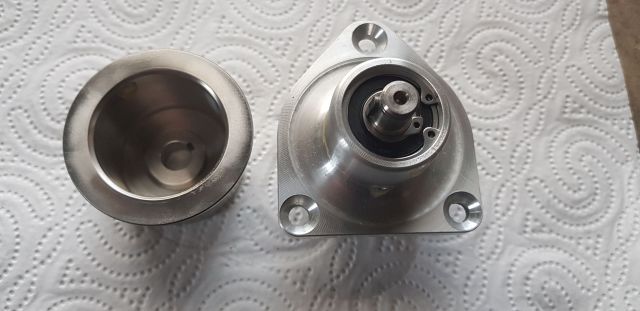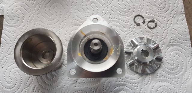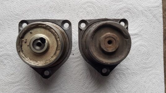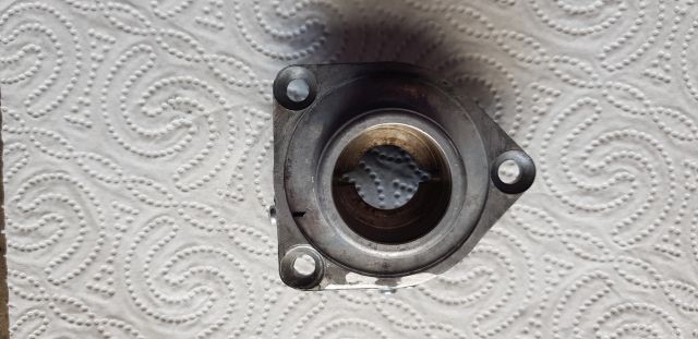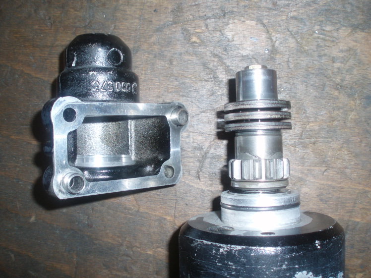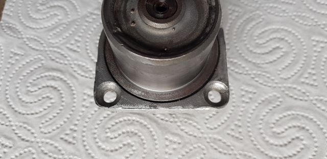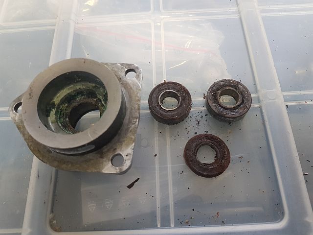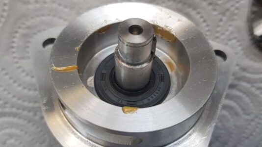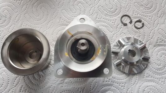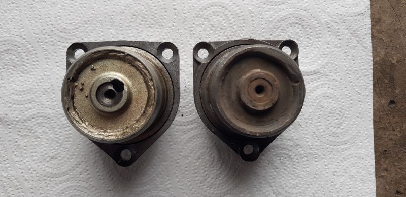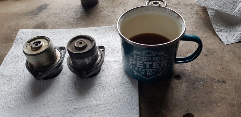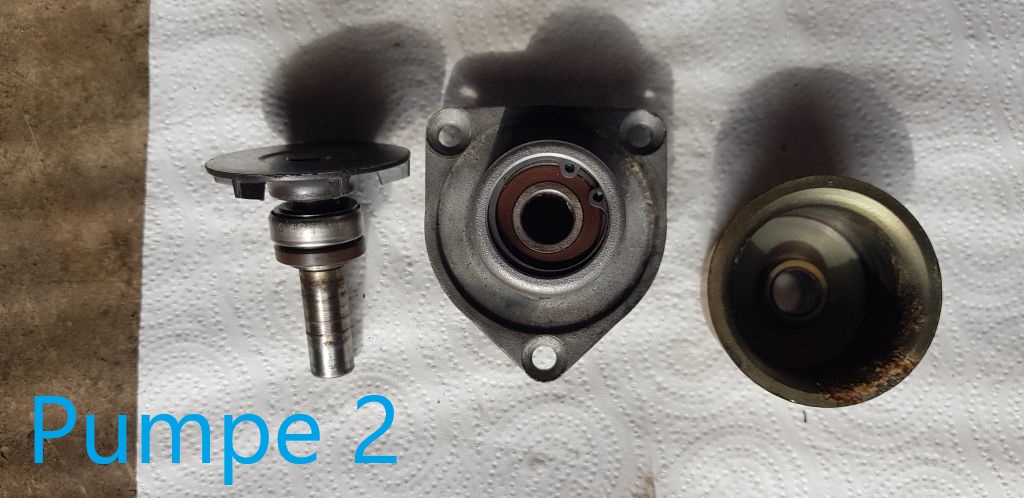 Zur Pumpe 1: Auffällig war eine Verschraubung mit einem M6 Gewinde in der Welle auf der Seite der Antriebsrolle. Vermutlich eine mangelhafte Passung. In der Tat konnte man die Welle mit leicht erhöhter Handkraft herausdrücken. Vermutlich wurde die Pumpe schon mehrmals zerlegt. Eingebaut sind Z - Kugellager, ziemlich verölt, besser wären 2 RS Lager, original waren nur offene Lager verbaut. Die verbaute Gleitringdichtung hat keine Keramikreibflächen und sollte auch ausgetauscht werden. Schätzung der Kosten einer Überholung: GRD 35 €, 2 Lager 10 €, neue Welle anfertigen in Eigeninitiative 30 €. Dies alles ohne Gewähr