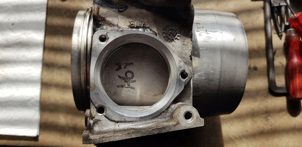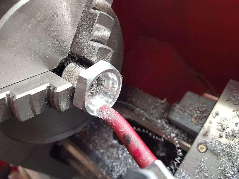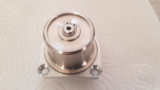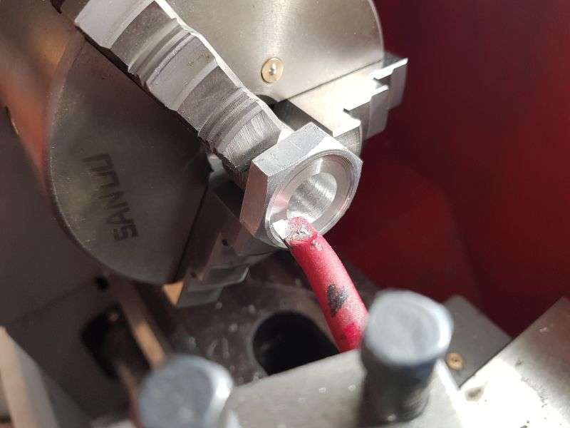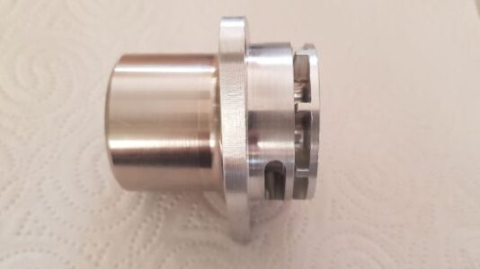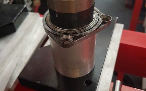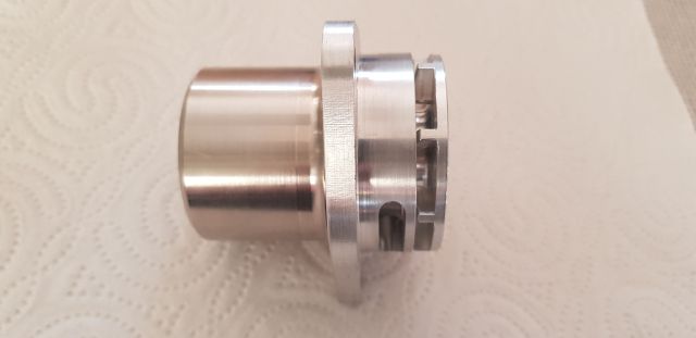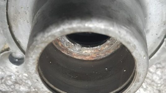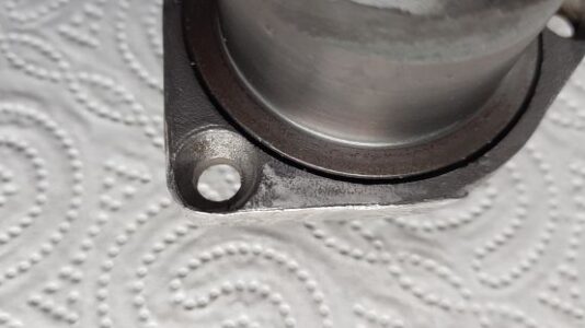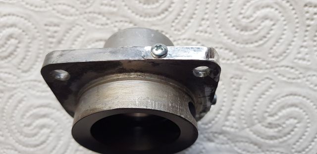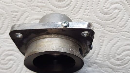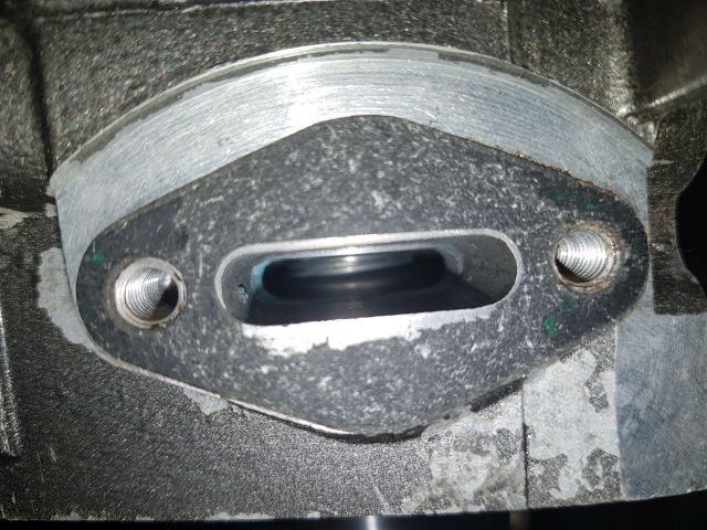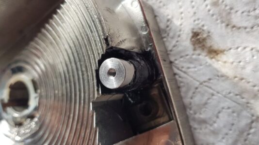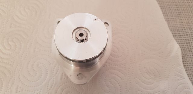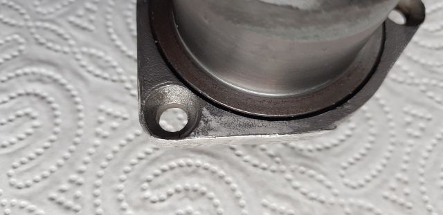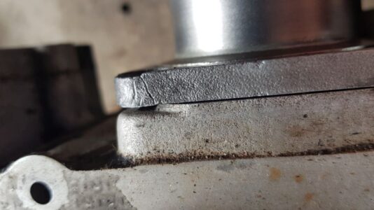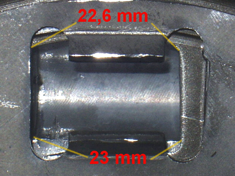 Nicht schön, der Feinschliff fehlt, aber die Pumpe passt in die erweiterte Öffnung. Es verbleibt auch noch genügend Fläche der 45 Grad Kante für die Abdichtung mittel O-Ring. Eine Zylinderschleiferei bzw. mechanische Werkstatt kann das professioneller Auffräsen