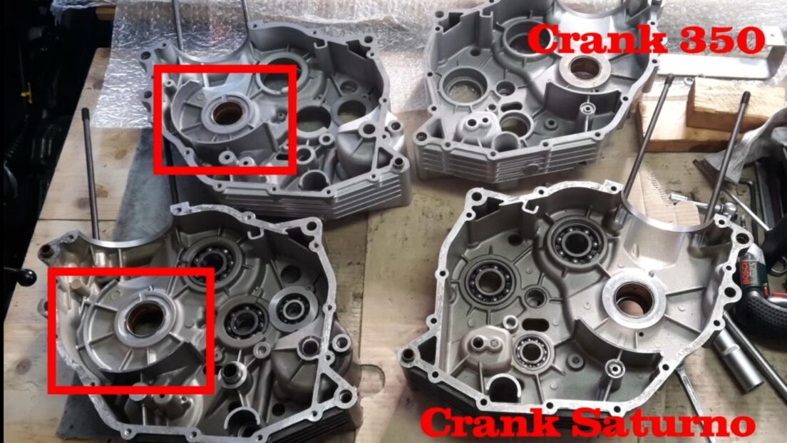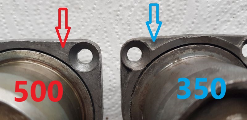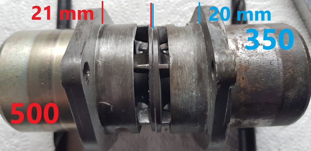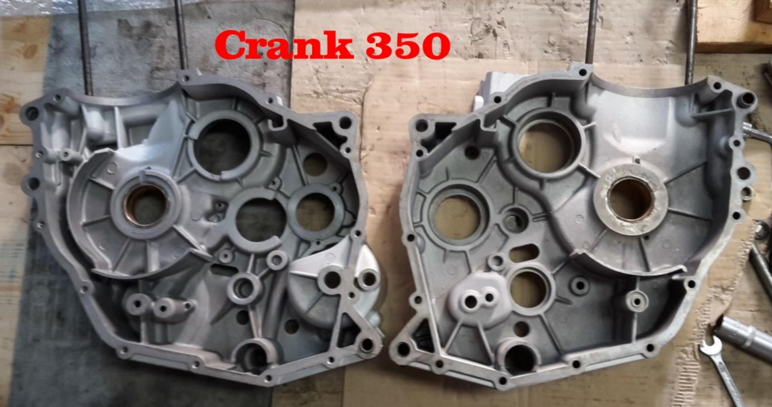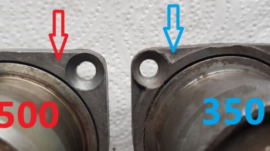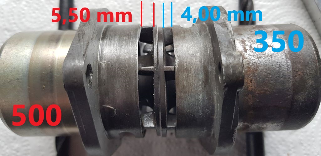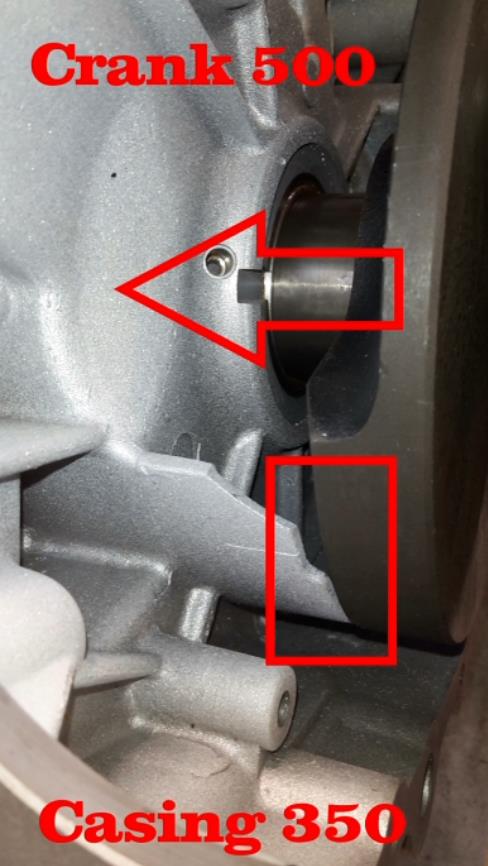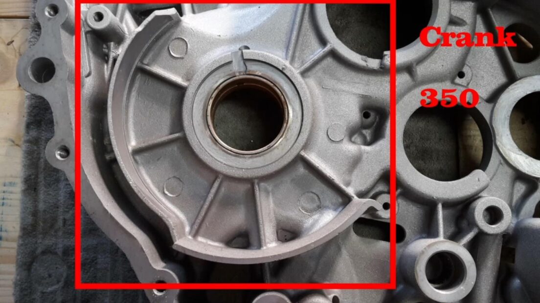 Die Unterschiede der Kurbelgehäuse zwischen 350 cc, 500 cc und 560 cc: Die 350 cc Kurbelwellen habe einen kleineren Durchmesser als 500 cc und 560 cc Wellen. Im 350 cc Kurbelgehäuse ist der Gußsteg um die Kurbelwelle bis oben hin geführt. Die 500 cc und 560 cc Kurbelgehäuse haben dies nicht. Eine 500 cc bzw. 560 cc Kurbelwelle passt daher nicht in eine 350 cc Gehäuse. Allerdings kann man den Steg abfräsen und damit das 350 cc Gehäuse auch für 500 cc Wellen verwenden. Ein weiterer Unterschied der Gehäuse ist der Durchmesser für den Zylinderhals. Der ist bei 350/500 cc identisch, bei 560 cc größer.