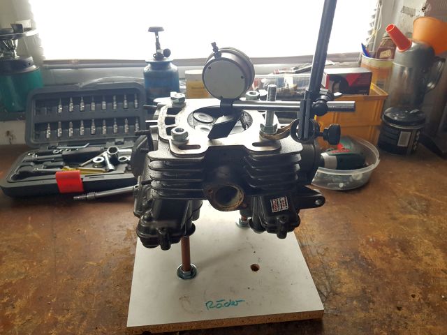 Habe ja weiter unten geschrieben, dass ich mich um das Erfassen der realen Ventilhübe kümmern will. Einen kleinen "Prüfstand" habe ich heute (03.03.2023) flux gebastelt. Zu sehen ist ein 350 cc Dakotakopf. Die Messreihe soll bestehen aus einem 350 cc und 560 cc Kopf, den jeweiligen Nockenwellenpärchen und den 4 verschiedenen Kipphebeln, um eventuelle Unterschiede in der Profilform zu erkennen. Achtung: Dieser Aufbau könnte auch benutzt werden für das Erfassen der Ventilerhebungskurven, aber das ist noch eine ganz andere Geschichte