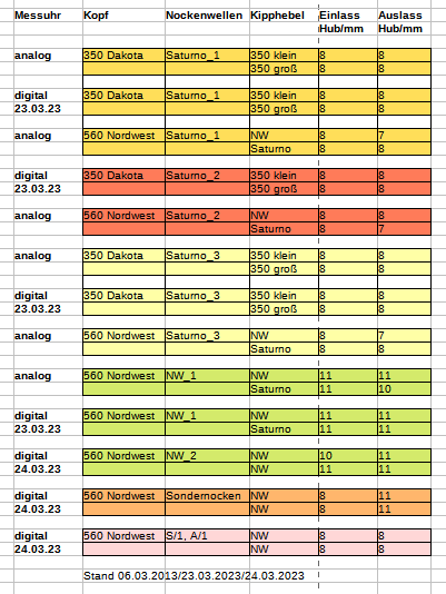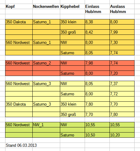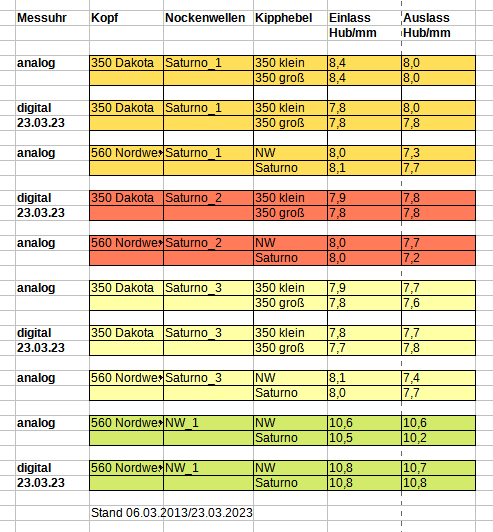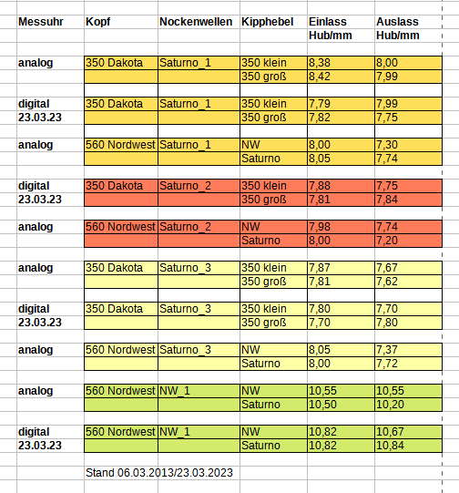 Stand 06.03.2023: Es wird komplizierter als ich es mir vorgestellt hatte. Gemessen habe ich derzeit 3 verschiedene Sätze Saturnonocken und einmal Nordwest in zwei verschiedenen Köpfen mit den vier verschiedenen Kipphebeln. Einmal abgesehen von vorhandenen Messfehlern durch den Versuchsaufbau sind dennoch Tendenzen zu erkennen. Dass die NW Nocken einen größeren Hub haben, als alle anderen Serienwellen ist ja allgemein bekannt. Was mich aber "nervös" macht sind die "deutlichen" Unterschiede der Saturnowelle_1 in den beiden verschiedenen Köpfen. Tendenziell lese ich die Werte so, dass die 350 cc Kipphebel einen größeren Hub erzeugen. Um dies zu verifizieren werde ich als nächstes die Kipphebel zwischen den Köpfen tauschen und erneut messen. Dann warten noch 10 weitere Nockenwellensätze auf eine Messung!