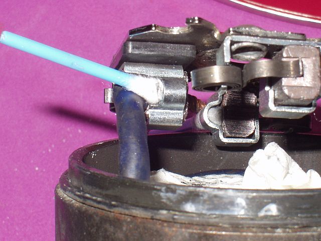 BI4 Anlasser: Sollte man mal in die Verlegenheit kommen, einen Anlasser zwecks Reparatur/Inspektion/Reinigung zerlegen zu müssen, ergibt sich spätestens beim Zusammenbau das "Problem", die 4 Kohlen auf den Läufer zu fummeln. Hier hilft ein einfacher Trick, die Kohlen unter Federspannung mit Wattestäbchen zu blockieren. Wenn die Kohlen auf die Wicklung gerutscht sind, können die Stäbchen entfernt werden
