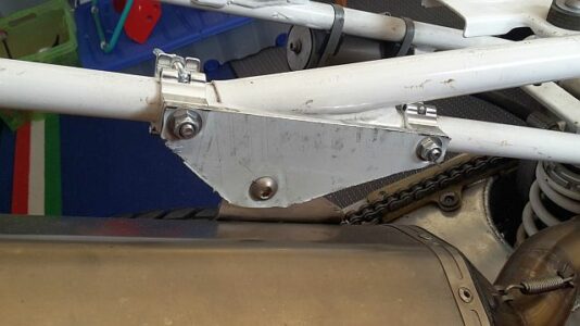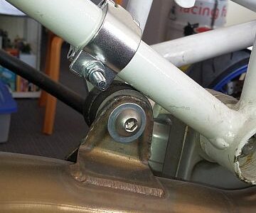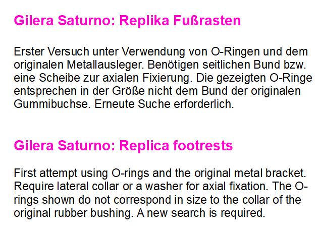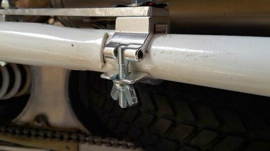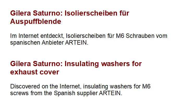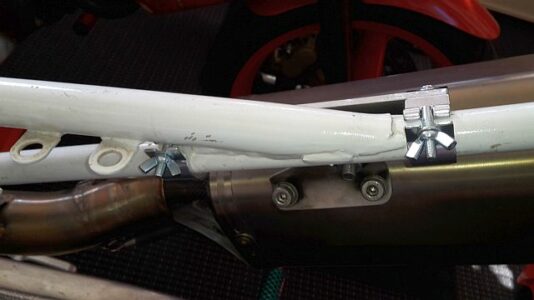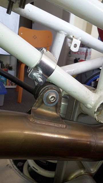 Gilera Saturno: Musste neulich einen REMUS Auspuff an einen Saturnorahmen anpassen. Um ein aufwändiges Schweißen von Laschen zu vermeiden habe ich mir Schraubschellen im passenden Rahmenrohrdurchmesser besorgt. Funktioniert prima