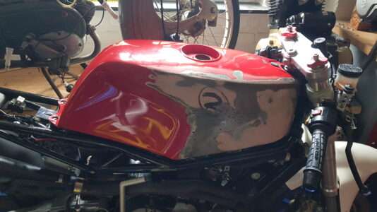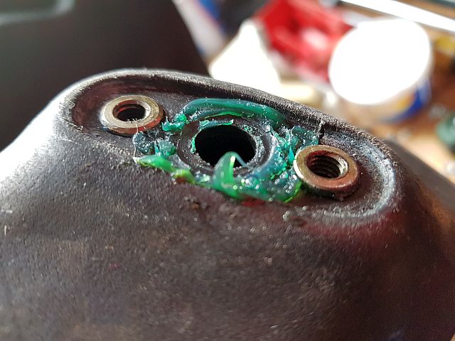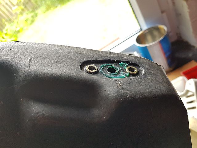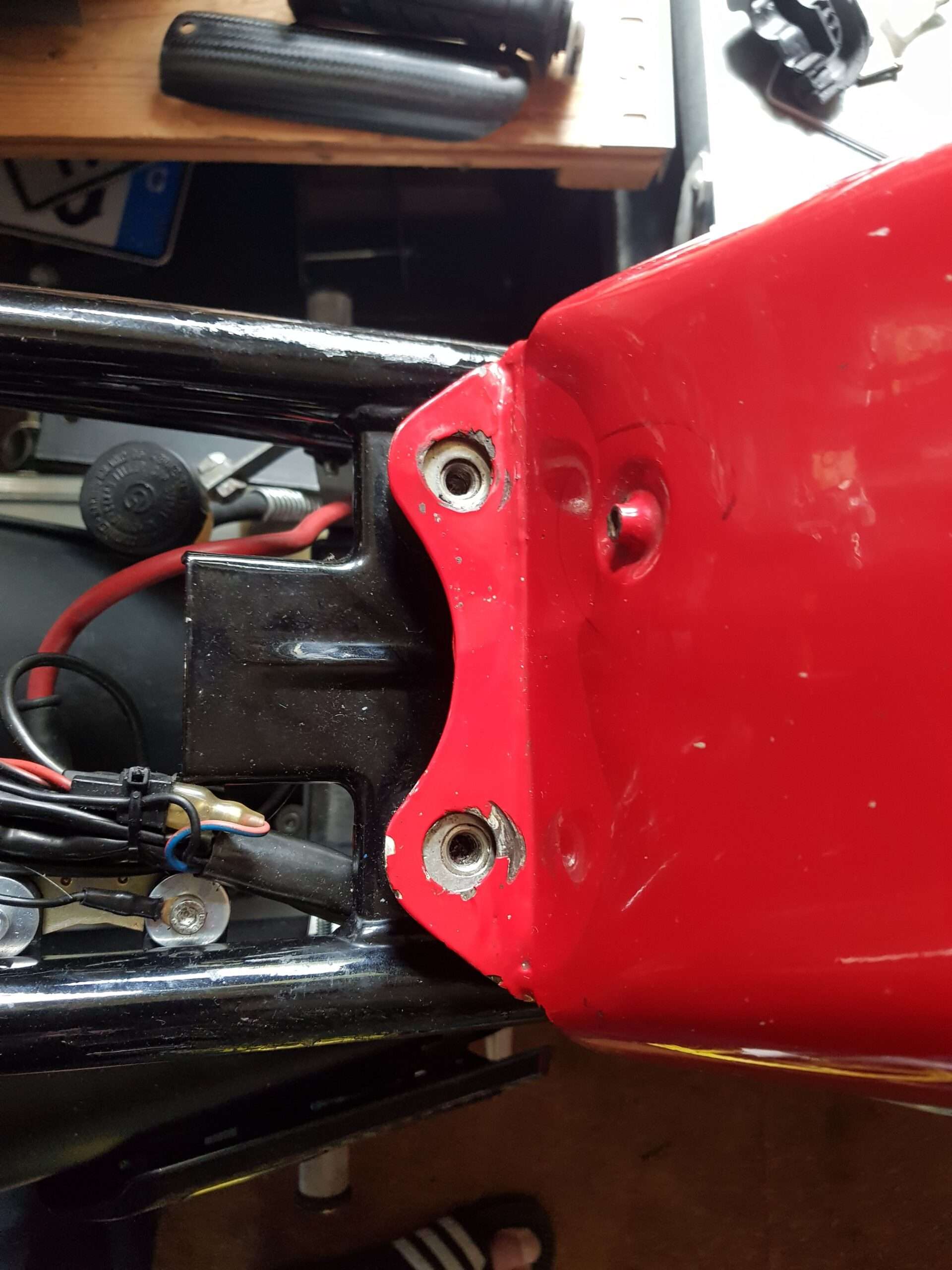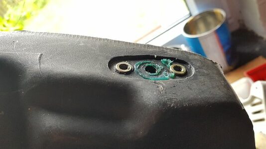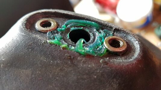 Gilera Nordwest: Bedingt durch einen defekten Benzineinfüllstutzen musste der Tank an unserer NW getauscht werden. Nach Montage neuer Benzinhähne stellte sich auf beiden Seiten leichte Benzinundichtigkeiten im Flaschbereich der Hähne heraus, da half auch Abdichtpampe nicht. Da inzwischen am "alten" Tank das Gewinde repariert war, wurden die Tanks wieder getauscht. Nach Demontage der Hähne war die Undichtigkeit nur wie folgt zu erklären: Die 4 Gewindeeinsätze ragen zu weit vor, so daß beim Anziehen der Benzinhähne der abdichtende O-Ring nicht genügend Vorspannung bekam und "schwitzte". Als "Reparatur" werde ich eine entsprechend dicke Scheibe einkleben, um die Differenz auszugleichen