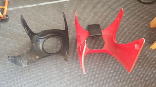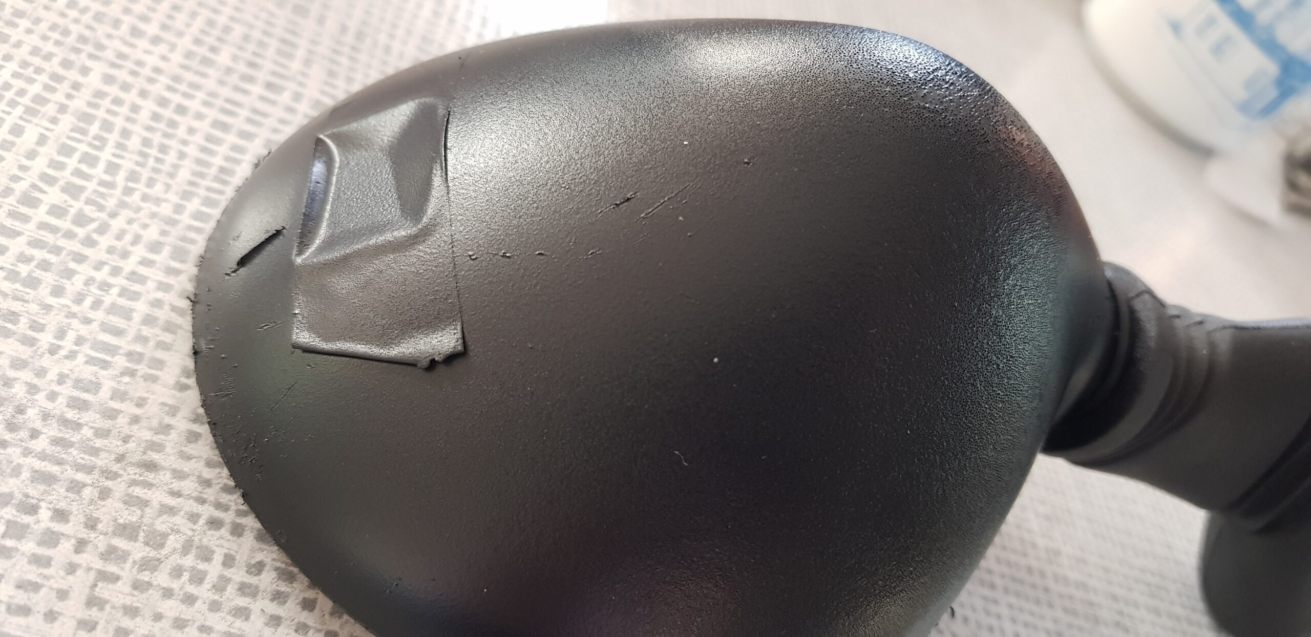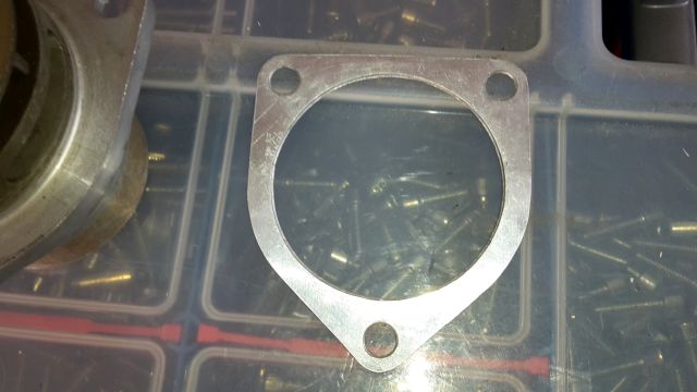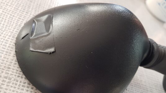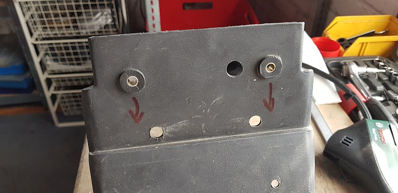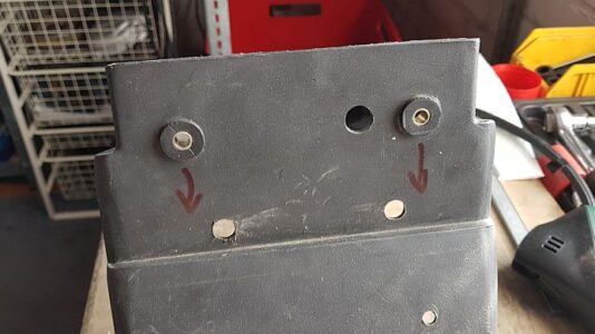 Defekte Wasserpumpengehäuse. Risse im Schraubenbereich. Teil 3: Habe mir beim zweiten, defekten Gehäuse das Fixieren des Blechs mit zwei M 3 Schrauben gespart. Nach dem Verkleben habe ich das Blech mit Tape positioniert. Das hat völlig gereicht. Nach dem Aushärten über Nacht mittels Proxxon das Blech verschliffen