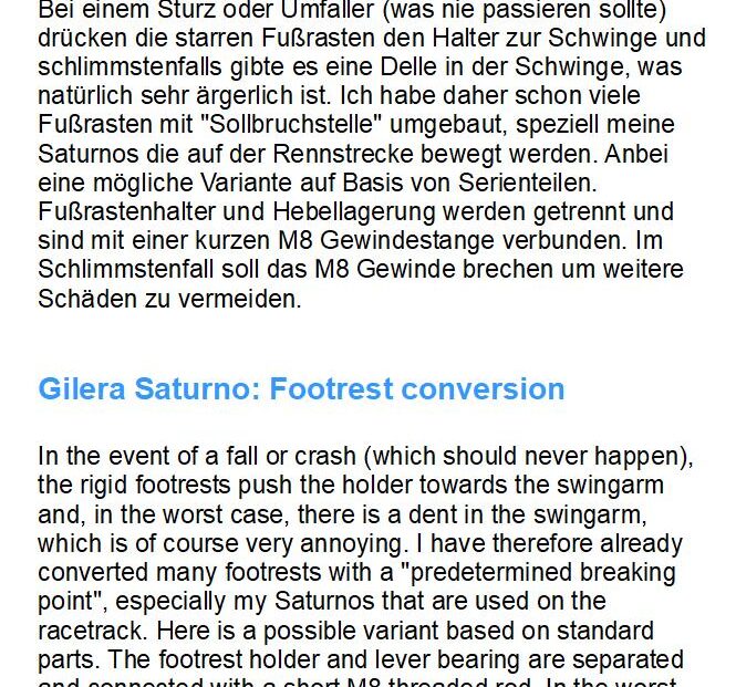 Gilera Saturno: Federbeinumlenkhebel Wer hat schon einmal an seiner Saturno die Umlenkhebel demontiert, geprüft und neu gefettet? Bei den RC und Nordwest-/Nordcapemodellen befindet sich am Umlenkhebel ein Schmiernippel. Warum wohl? Die Lagerbuchsen im Saturno Hebel sind zweigeteilt mit einem mittigen Zwischenraum. Dort würde ein zusätzlicher Schmiernippel genau hinpassen. Streng genommen müssten sich in den Buchsen eine Schmierwendel zur Verteilung des Fetts auf der Länge der Buchse befinden. Haben die Saturnobuchsen aber nicht. Man könnte natürlich mit einem Dremel oder Proxxon und einem dünnen Frässtift händisch eine Nut einschleifen. Das habe ich mir aber geschenkt. Allerdings dürfte die Passung zwischen Buchsen und Lagerachse auch nicht 100 % spielfrei sein. Mit ordentlich Druck aus einer Fettpresse sollte die Fettverteilung eigentlich funktionieren.