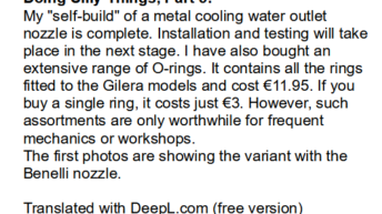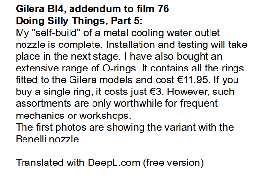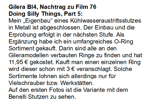 29.03.2023 Gilera Saturno: Einbau einer 560-iger Wasserpumpe in den 500-er Zylinder. Wie schon an anderer Stelle thematisiert gibt es eine Werksanleitung für den Einbau der "kleinen" 500-er Wasserpumpe in den großen 580 cc Tuningzylinder. Wie wäre es aber umgekehrt? Bei gleichem Flanschbild ginge es nur durch Auffräsen der Gehäuseaufnahme