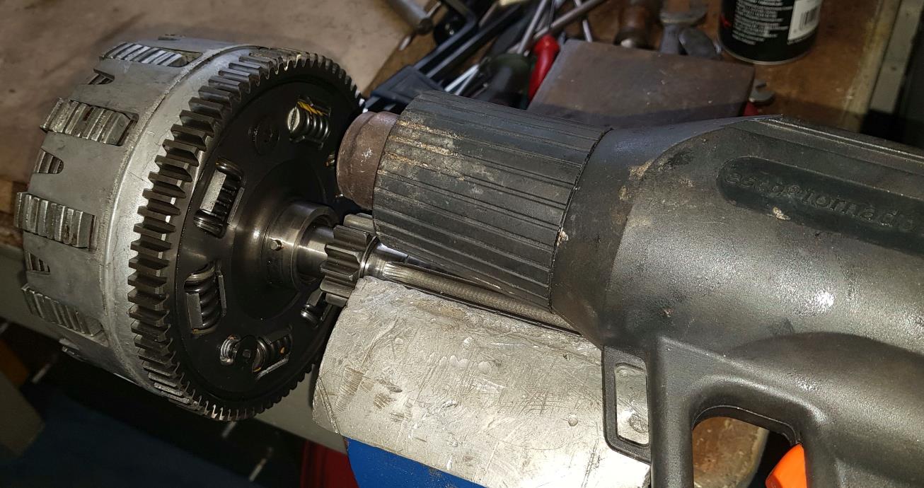 Leider hat meine alte Bohrmaschine etwas Lagerluft und ist bei kleinster Drehzahl recht laut. Für erklärende Kommentare hätte ich brüllen müssen, das habe ich mir erspart. Der "Kenner" wird sehen, dass die Drehrichtung im Uhrzeigersinn ist. Das hat mit dem in die Hauptwelle eingeschraubten Einsatz zu tun. Die reale Drehrichtung ist allerdings gegen den Uhrzeigersinn. Dabei hat sich der Einsatz aber immer selbständig herausgedreht, da ich die Bohrmaschine nicht ausreichend fixiert habe. Das muss ich noch verbessern, aber für einen ersten Versuch m. E. unwichtig. Geschaltet wurde (man kann es auch an meiner Handbewegung erkennen) vom Leerlauf in den ersten Gang, dann wieder über den Leerlauf bis zum 5. Gang und wieder zurück. Schön zu sehen dass immer zwei Gangpärchen zusammengeschaltet werden