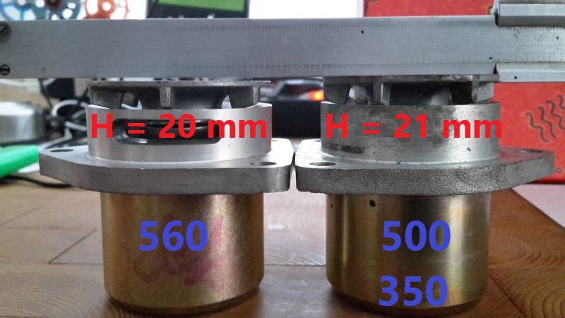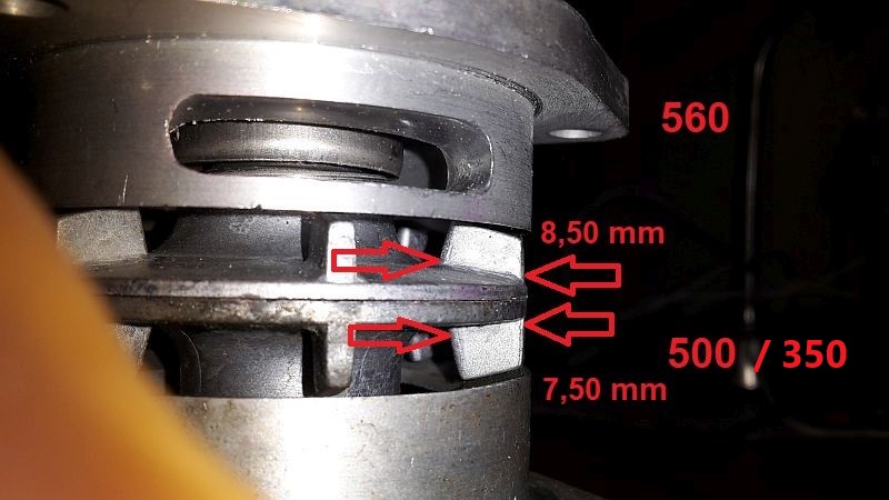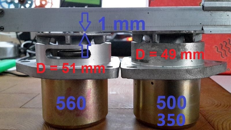Die optischen Unterschiede der 350/500 cc und 560 cc Wasserpumpen: Sind hoffentlich selbsterklärend. Beim originalen Saturnotunigkit gab es für den Einbau der 350/500 cc Pumpe in den 560 cc Zylinder einen Zwischenring für den Ausgleich des Unterschiedes im Durchmesser und 2 Distanzscheiben für den Ausgleich der Höhe