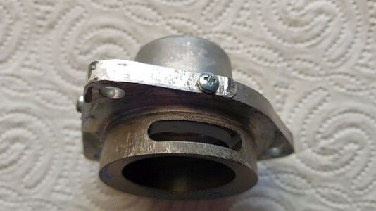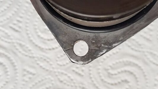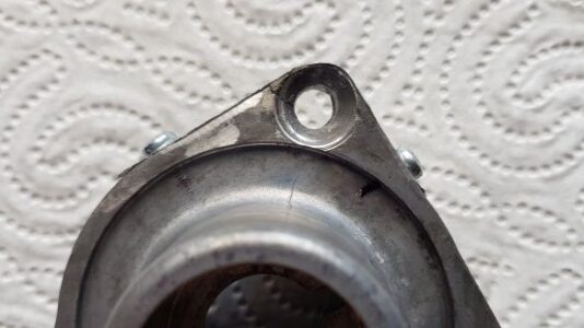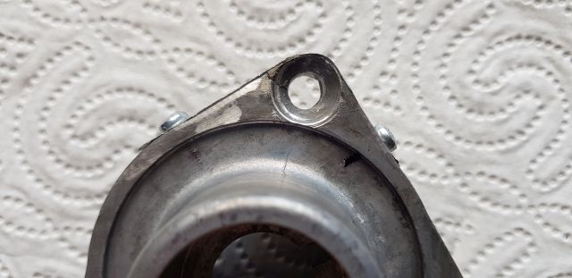 Defekte Wasserpumpengehäuse. Risse im Schraubenbereich. Teil 2: Erster Reparaturversuch mit einer dünnen Alublechmanschette, damit das Schraubenauge nicht endgültig abbrechen kann. Verklebt mit UHU-Plus, ausgehärtet unter Wärmeeintrag. Anschließend mit Proxxon und Schleifstein "verputzt". Nicht hübsch, aber für den weiteren Eigenbedarf ausreichend