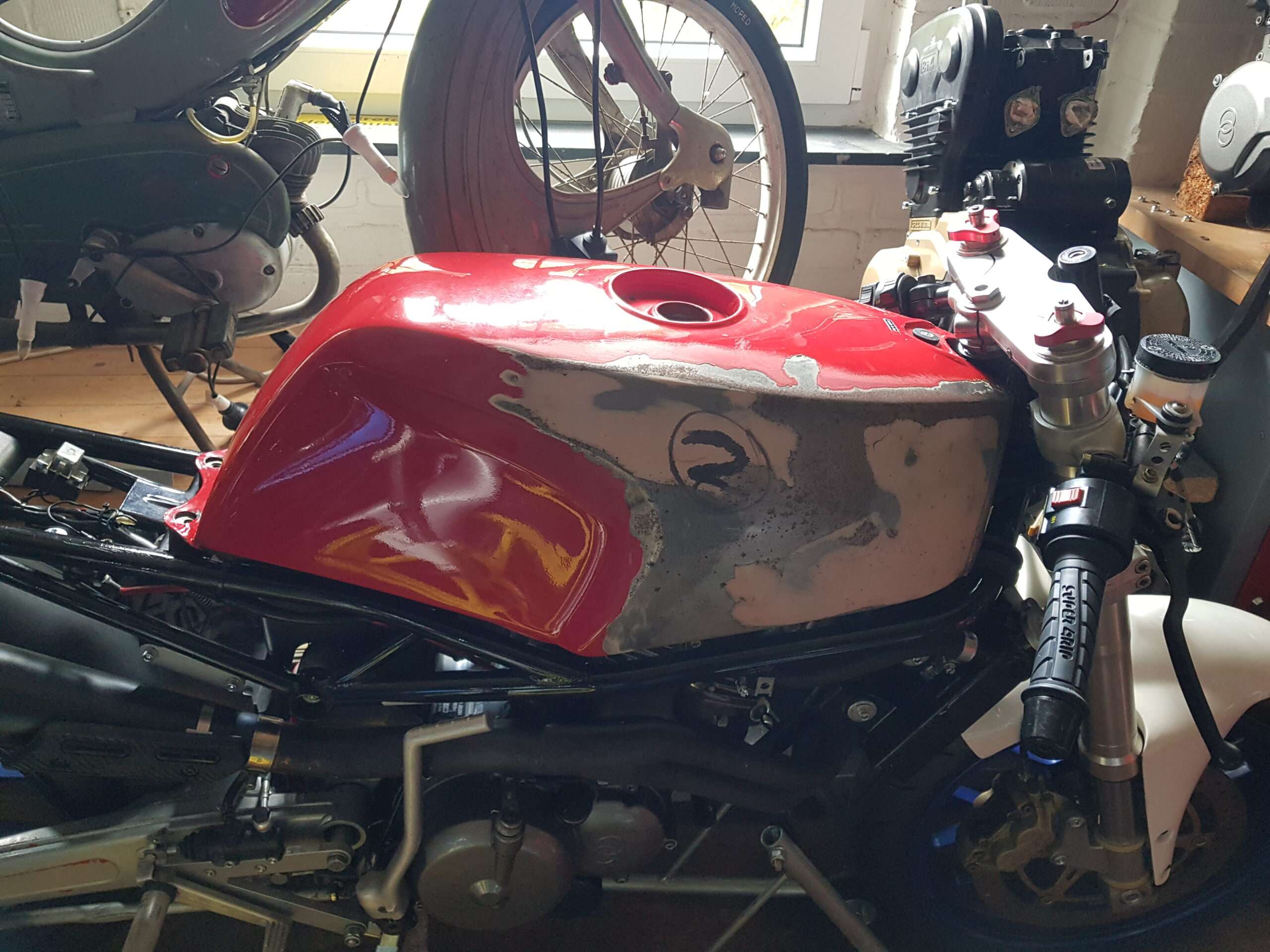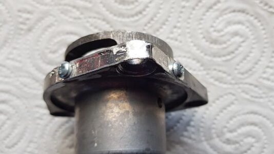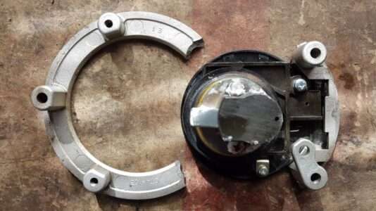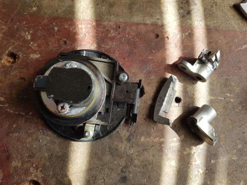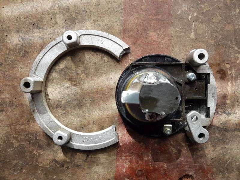 29.08.2025: Das ist mir noch nie passiert. Beim Ausbau eines Tankdeckels ist der äußere Ring gebrochen. Was tun? Die Bauteile des Saturnodeckels sind fast identisch mit einem Yamaha Deckel. Ich wollte den Saturno Verschluss mit dem Yamaha Aussenring kombinieren und dachte, mal "einfach" die Spannhülsen herauszuschlagen, denkste. Die Dinger stecken bombenfest. Dazu muss ich mir etwas überlegen. Ausbohren ist zu ungenau, da kann man mehr kaputt machen, falls der Bohrer abrutscht. Ich überlege, eine Halterung zu bauen, um den Deckel vertikal unter einer Presse zu positionieren. Es bleibt spanned.