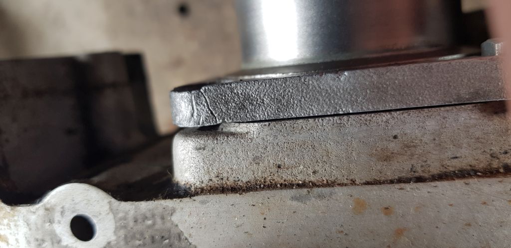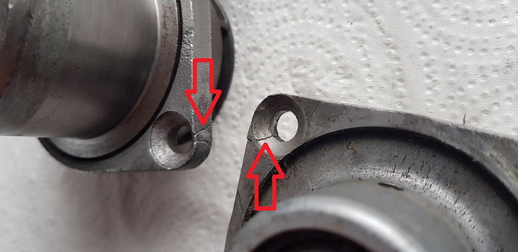 Defekte Wasserpumpengehäuse. Risse im Schraubenbereich. Teil 1: An zu fest angezogenen Senkschrauben kann es (eigentlich) nicht liegen. Ich denke eher es passiert beim Pumpenausbau. Eine Pumpe, die jahrelang eingebaut war, ist nun mal festgegammelt. Um die Pumpe auszubauen fehlt ein Teil von der Auflagefläche. Hier kann man einen dünnen Hebel zum Anlupfen ansetzen. Doch wenn die Pumpe zu fest sitzt passiert gar nichts. Automatisch hebelt man fester und schwupps reißt das Gehäuse. Mein Tipp ist recht einfach. Ich wärme den Bereich neben der Pumpe mit einer Heißluftpistole auf. Das hilft fast immer. Konstruktiv ist diese originale Ausführung m.E. fehlerhaft. Die Absenkung hätte man neben den Schrauben machen müssen, da wo das Pumpengehäuse massiv ist. Solche zusätzlichen Taschen kann man natürlich in Eigeninitiative selber fräsen. Leider besteht das Pumpengehäuse aus einer Pumpenlegierung, die nicht schweißbar ist. Um den Riß etwas zu stabilisieren kann man ein Blech in der Dicke des Pumpenflanschs anfertigen und "um die Ecke" legen, jeweils mit M 2 oder M 3 Schrauben fixieren und mit 2-Komponentenkleber sichern. Ich habe ja 2 defekte Gehäuse, da kann ich demnächst ja mal das Gesagte umsetzen