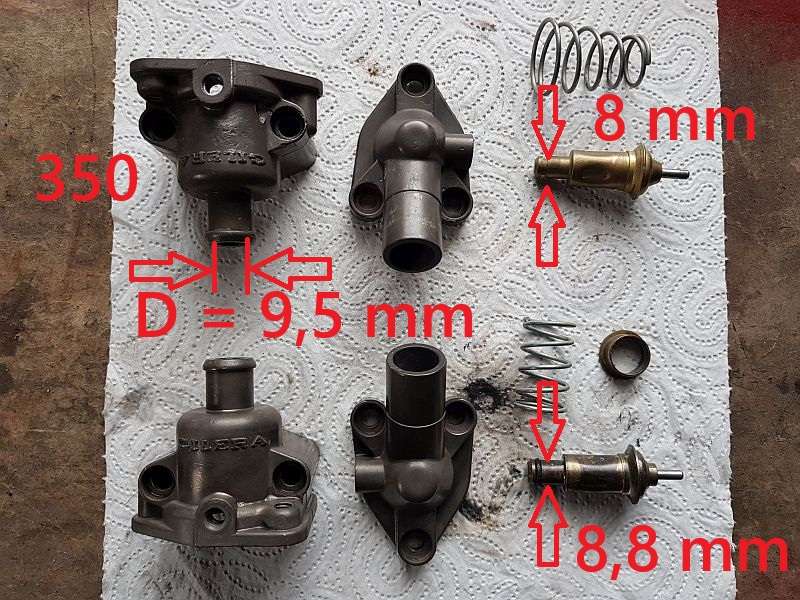 Thermostat gekauft. Hier das Ergebnis: Die Gehäuse sind (typisch italienisch) identisch. Nur die "Nase" am Thermostat ist unterschiedlich. 8 mm (350) zu 8,80 mm (500/560). Nun erkläte mir doch mal den Sinn von diesem Unsinn.