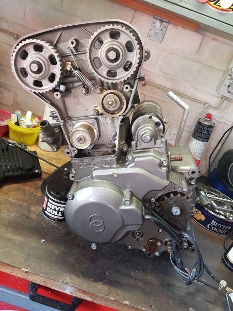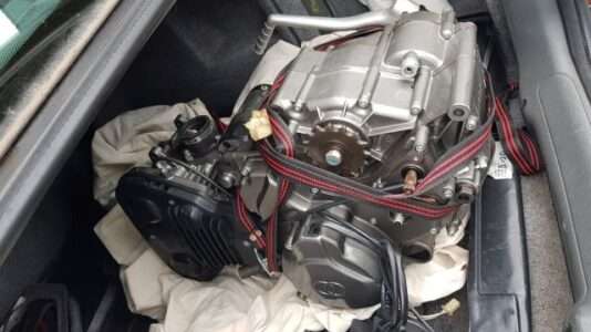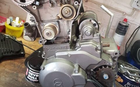 16.08.2025: Der 350 cc Saturnomotor liegt jetzt auf der Werkbank. Den Zahnriemen habe ich gleich entfernt, um die Wasserpumpe zu entlasten. Der Motor erscheint wirklich pfuschnagelneu.