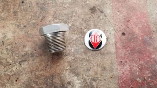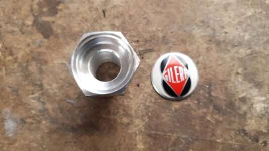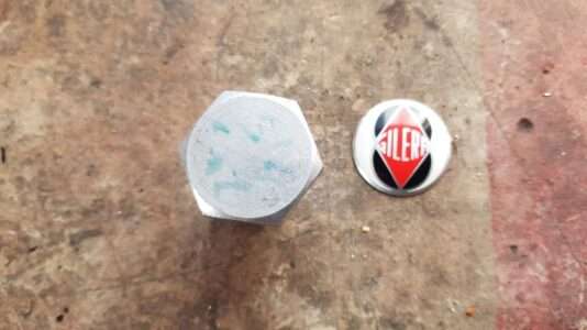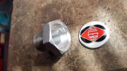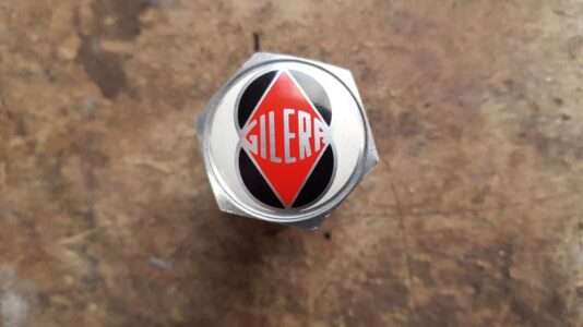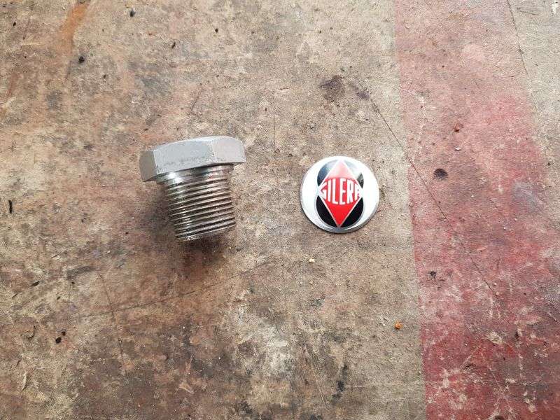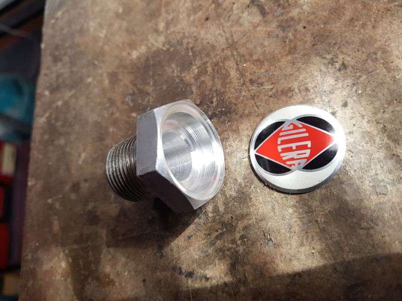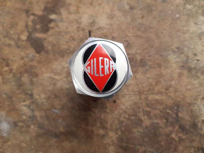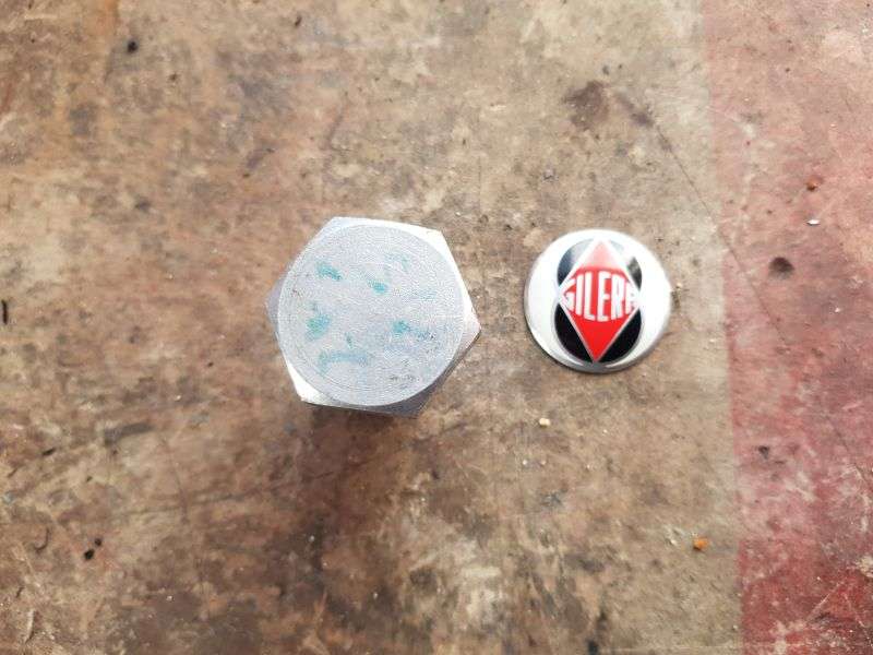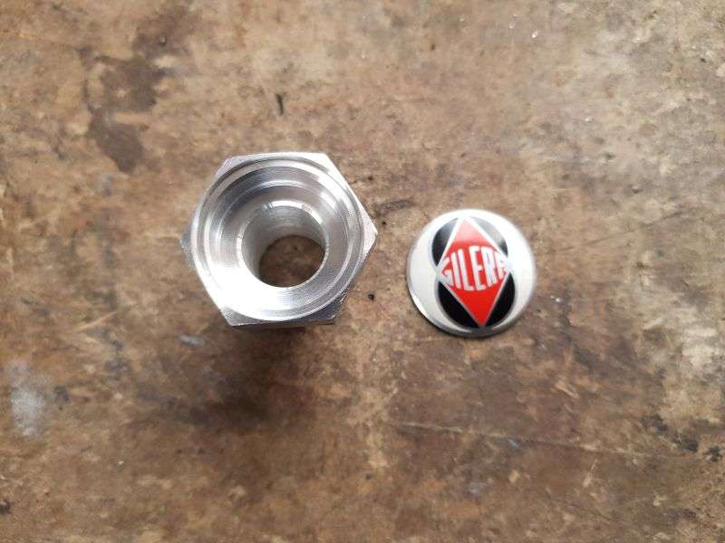 29.08.2025: Heute Vormittag kam mir der Gedanke, eine Steuerkopfschraube "aufzuhübschen". Ich habe noch einige neue Blech-Gilera-Embleme der "kleinen" Gileras, die genau passen würden. Zunächst einmal "Gewichtstuning" der Schraube und dann den Durchmesser ausgestochen. Fixieren des Emblems mit 2-Komponenten Klebstoff erst nach erfolgter Montage der Schraube.