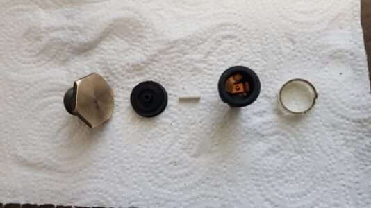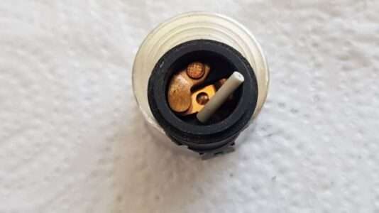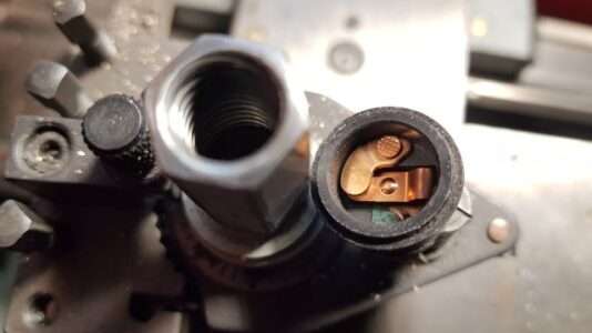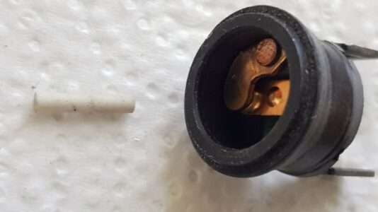09.01.2026: Wie funktioniert eigentlich der Thermoschalter im Wasserkühler für die Steuerung des Lüftungsgebläses? Ganz einfach, nämlich rein mechanisch. Im kalten Zustand hält der (weiße) Stift die beiden Kontakte (im schwarzen Teil) offen. Durch die Erwärmung dehnt sich das Messinggehäuse aus und der Kunststoffstift gibt irgendwann den Strom frei für den Lüfter. Ist schon ein kleines "Wunderwerk" der Technik, sieht man dem kleinen Ding von außen gar nicht an. Immerhin kann man den "Rest" noch als Verschlussschraube verwenden. Bei meinen Rennmaschinen habe ich den Lüfter manuell geschaltet.
