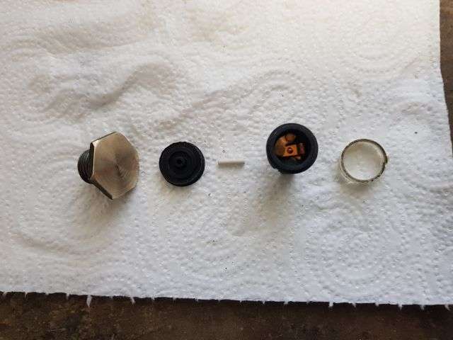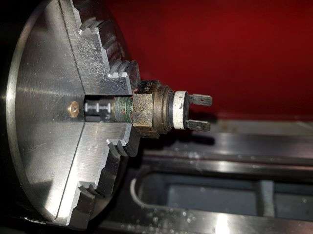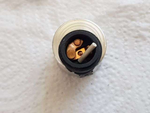 09.01.2026: Wie funktioniert eigentlich der Thermoschalter im Wasserkühler für die Steuerung des Lüftungsgebläses? Ganz einfach, nämlich rein mechanisch. Im kalten Zustand hält der (weiße) Stift die beiden Kontakte (im schwarzen Teil) offen. Durch die Erwärmung dehnt sich das Messinggehäuse aus und der Kunststoffstift gibt irgendwann den Strom frei für den Lüfter. Ist schon ein kleines "Wunderwerk" der Technik, sieht man dem kleinen Ding von außen gar nicht an. Immerhin kann man den "Rest" noch als Verschlussschraube verwenden. Bei meinen Rennmaschinen habe ich den Lüfter manuell geschaltet.