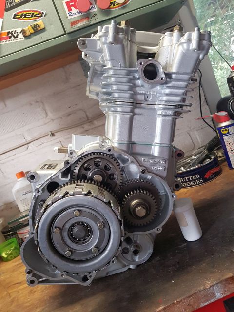 21.01.2026: Heute den Motor mit neuem Kolben/Zylinder/Kopf vervollständigt. Zur Erklärung: Vor vielen Jahren habe ich einen neuen 350 cc Motor °geschlachtet" = den Motor auf 534 cc mit Saturnolopf umgebaut. Übrig blieben daher die jetzt verbauten Neuteile. Die rechtsseitigen Zahnräder + Kupplung + Ölpumpe sind Gebrauchtteile, aber natürlich in geprüften bzw. überholten (Kupplung) Zustand.