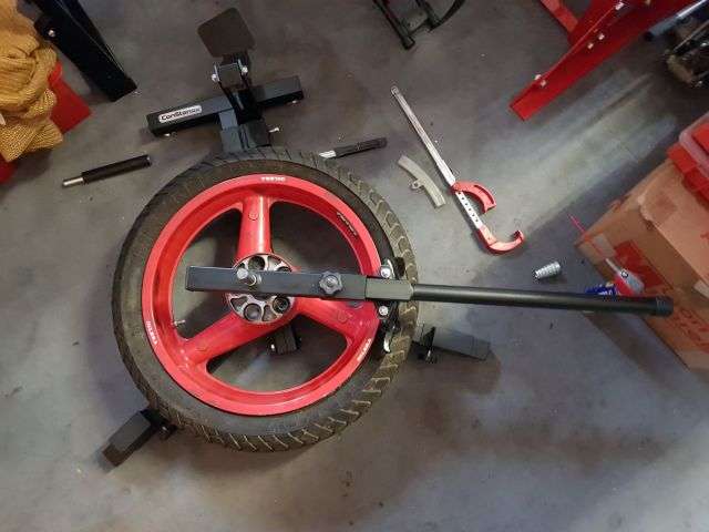 12.12.2025: Ich habe einige Saturnoräder mit abgefahrenen Reifen stehen. Reifenwechseln (schlauchlos) selber machen, wollte ich schon seit Jahren. Also kurzerhand bei MOTEA, zum Black Friday Rabatt, ein Montiergerät bestellt. Erste Überraschung, das Gerät wurde mit einer 20 mm Achsaufnahme geliefert, die Saturnos haben aber 17 mm Achsen. Was tun? Habe mir in passender Länge ein 17 mm glattgezogenes Stück "Silberstahl" besorgt. Das musste nur noch leicht mit Schmiergelleinen abgezogen werden, damit die Räder satt dazu passten. Natürlich musste auch noch am Ende ein Gewinde M14x1,5 für die Befestigung geschnitten werden. Diverse brauchbare, aber auch viele unbrauchbare Anleitungen, kann man sich in Youtube ansehen. Mein erster Versuch mit einem originalen, bockenharten, 35 Jahre alten Pirelli war schon etwas mühsam und benötigte leichten Gewalteinsatz, aber es funktioniert. Das Gerät, offensichtlich aus chinesischer Quelle, ist massiv gebaut und für den Hobbyschrauber gut geeignet.