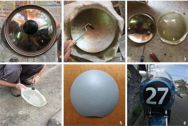 08.01.2026: Wie wandelt man eine Serienverkleidung mit Lampenausschnitt in eine Rennverkleidung ohne Lampenausschnitt um? Ganz einfach! Diese Anregung haben ich in einer japanischen Saturnoseite gefunden. Man nehme einen gewölbten Topfdeckel in der entsprechenden Größe als "Form" zum Laminieren eines GFK Verschlußdeckels. Zum Aushärten des GFK-Harzes braucht es schon wärmere Temperaturen als jetzt im Winter und in der Wohnung will ich das nicht machen, das Zeug stinkt bestialisch.
