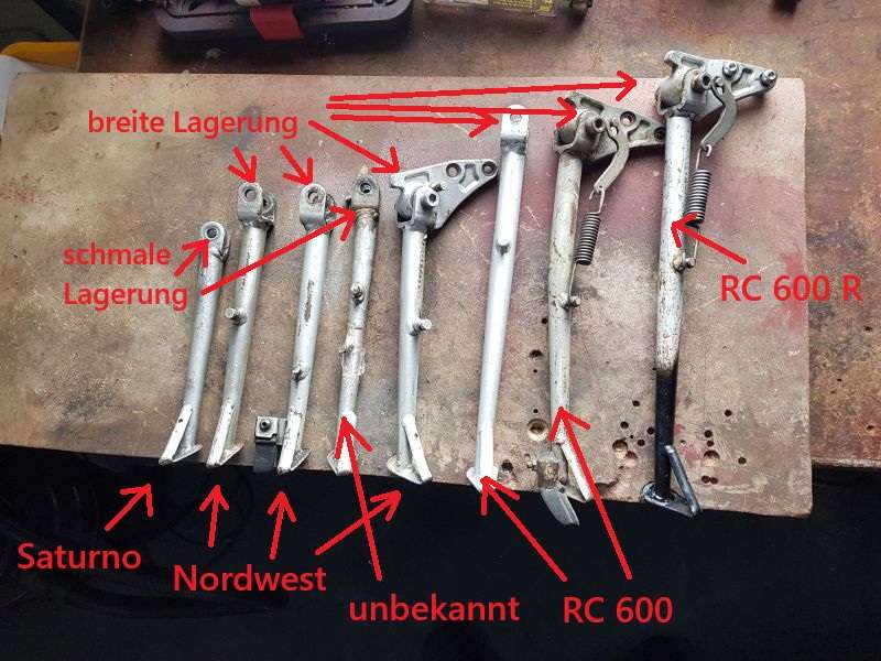 10.01.2026: Aktueller BI4 Seitenständervergleich aus meinem Teilefundus nach Länge sortiert. Die "Hochbeinigen" haben natürlich deutlich längere Seitenständer als Saturno und Nordwest. Dabei gibt es noch Unterschiede in der oberen Lagerung, schmal wie bei der Saturno oder breit wie bei den RC´s. Dann gibt es noch die originale, starre Variante mit dem Buzzer und dem Gummi am Fußende oder die "deutsche" Variante selbsteinklappbar. Die Seitenständer der RC 600 könnten von der Länge her auch an Dakota bzw. XRT verbaut sein, da müsste man aber mal die Teilenummern vergleichen.