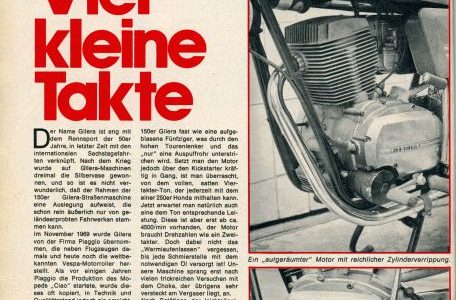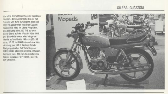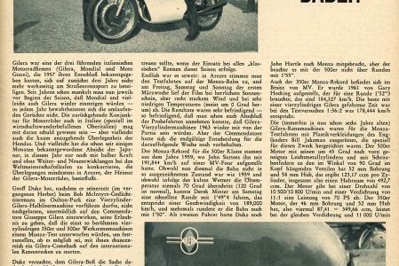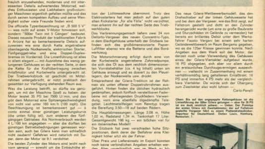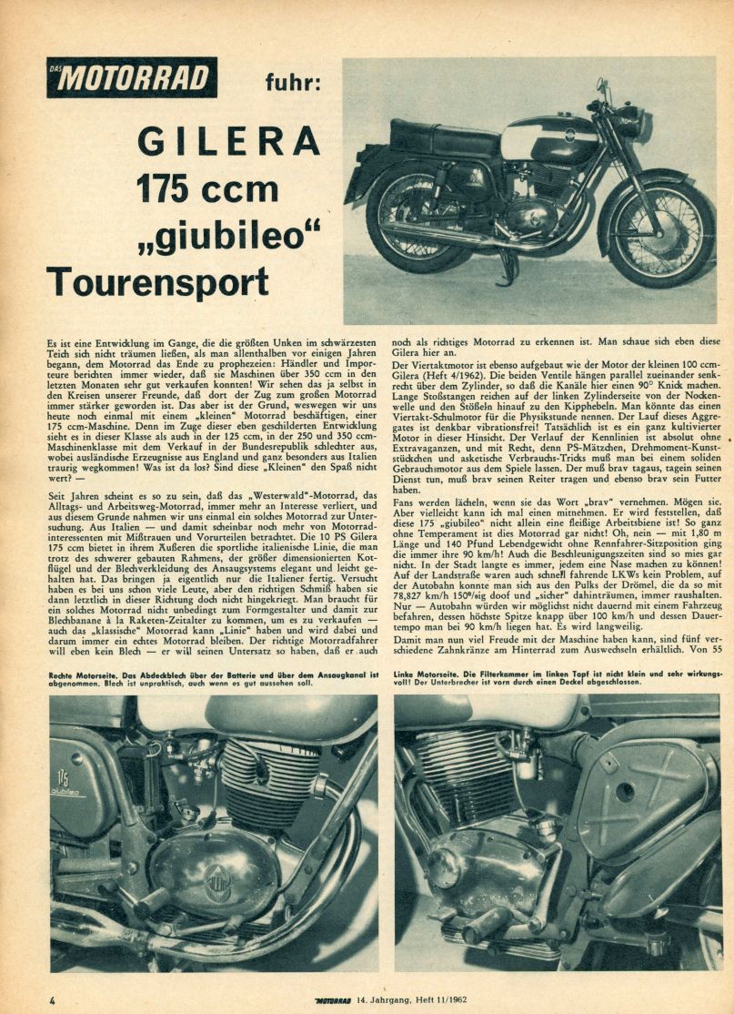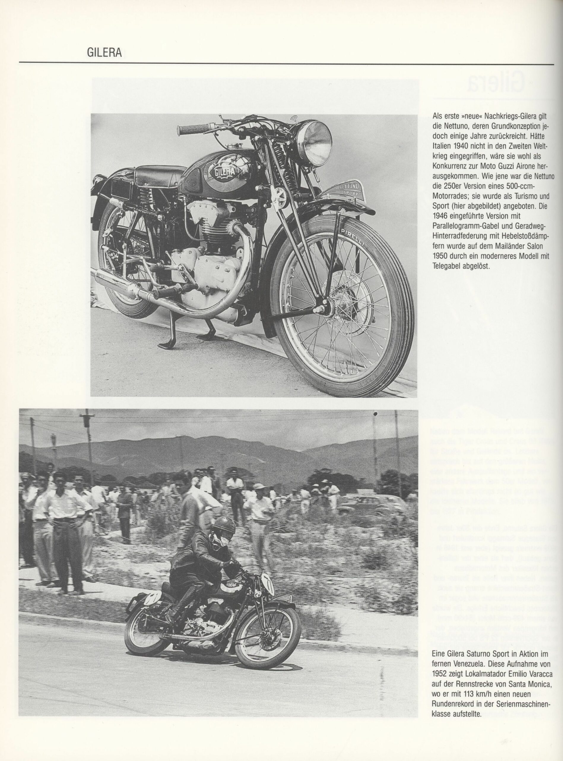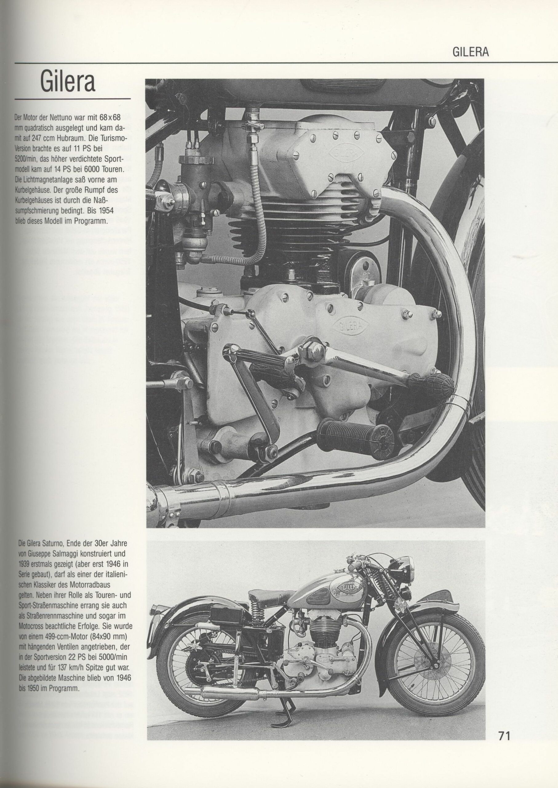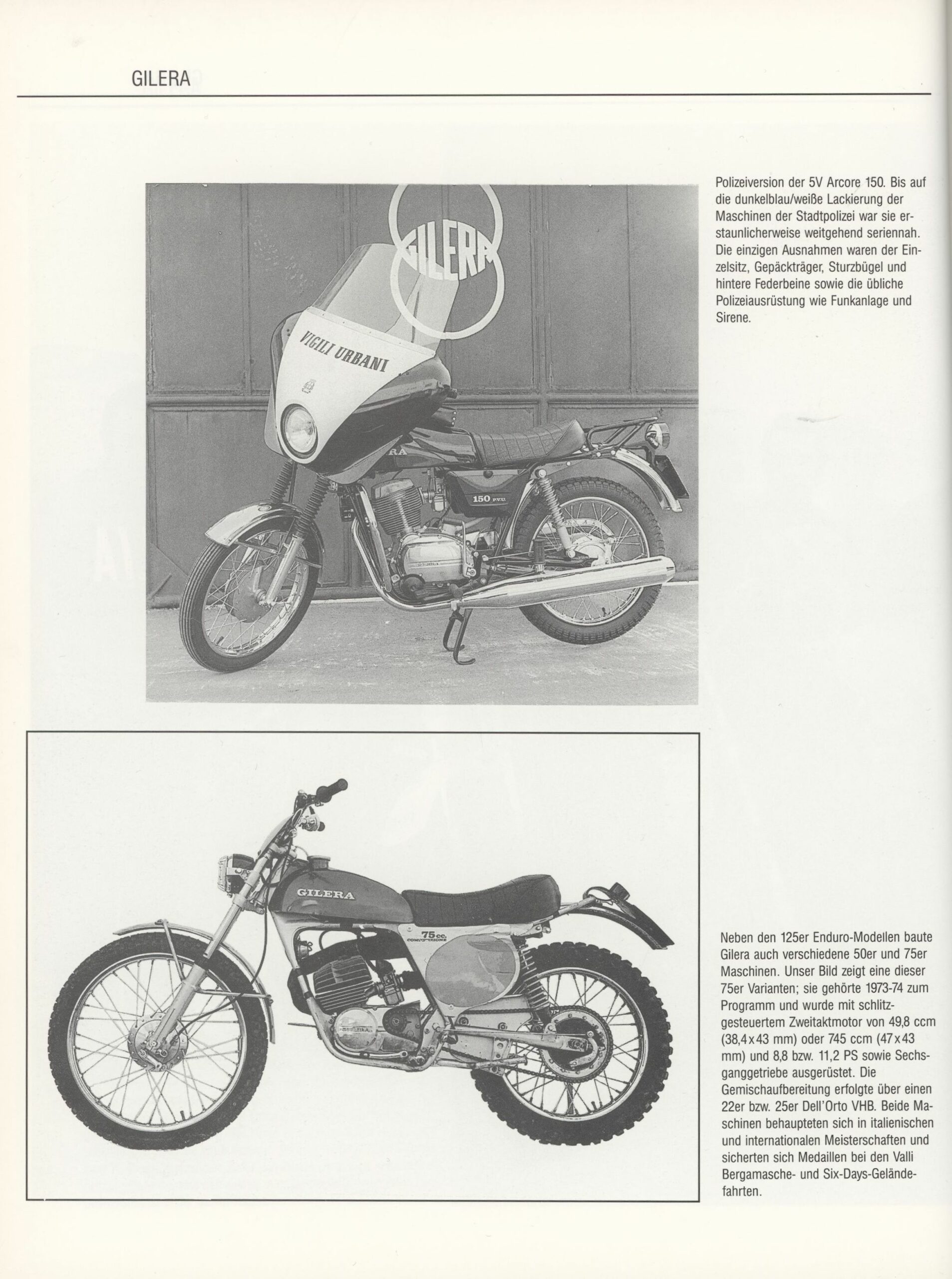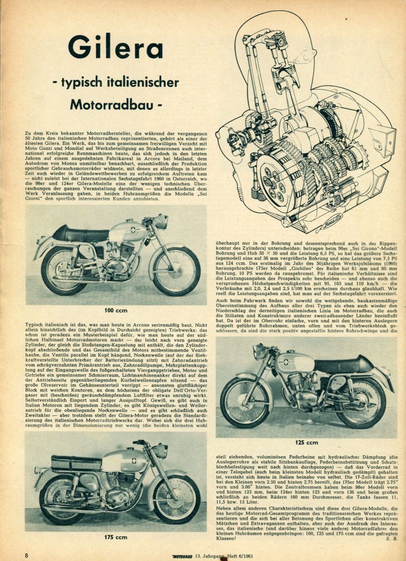 Presseschau III (1961 – BI4) - Seitenlayout überarbeitet 11.08.2024- Titelbild (Quelle: Internet) ------------------------------------------------------------------------------------- Bunte Mischung Gilera Werbung (Quelle: Internet) ------------------------------------------------------------------------------------- Piaggio/Gilera Broschüre 1969 (Quelle: Privatarchiv) ------------------------------------------------------------------------------------- Werbung Gilera 125 Zweitakt (Quelle: Internet) ------------------------------------------------------------------------------------- Werbung Gilera 200 Zweitakt (Quelle: Internet) ------------------------------------------------------------------------------------- Werbung Gilera 250 Zweitakt (Quelle: Internet) ------------------------------------------------------------------------------------- Datenblatt Gilera 125 XR2 Marathon (Quelle: Internet) ------------------------------------------------------------------------------------- Datenblatt Gilera 125 Top Rally (Quelle: Internet) ------------------------------------------------------------------------------------- Aus MOTALIA, Heft 250/2011 über die Gilera CX 125 (Quelle: Privatarchiv) ------------------------------------------------------------------------------------- Aus Gummikuh, Heft 1/1994 über die Gilera Arcore 150 (Quelle: Privatarchiv) ------------------------------------------------------------------------------------- Aus Gummikuh, Heft 2/1991 über die Gilera Arcore 150 (Quelle: Privatarchiv) ------------------------------------------------------------------------------------- Aus Oldtimer PRAXIS, Heft 5/2022 über den Motor einer Gilera Arcore (Quelle: Privatarchiv) ------------------------------------------------------------------------------------- Aus dem Buch Italienische Motorrad Klassiker Band 1 von Mick Walker über die Gilera Produktpalette (Quelle: Privatarchiv) ------------------------------------------------------------------------------------- Aus MOTOCICLISMO/Italien, Ausgabe ? über die Gilera Elmeca 125 Regolarita(Quelle: Internet) ------------------------------------------------------------------------------------- Aus Das MOTORRAD, Heft 7/1963 über Gilera wieder dabei (Quelle: Privatarchiv) ------------------------------------------------------------------------------------- Aus MOTO CICLISMO d´Epoca/Italien, Heft 11/2010 über die Gilera Giubileo 98 und 98 Extra(Quelle: Privatarchiv) ------------------------------------------------------------------------------------- Aus Moto revue/Frankreich, Heft 3001/1991 über die Gilera 125 CX(Quelle: Privatarchiv) ------------------------------------------------------------------------------------- Aus MOTO JOURNAL/Frankreich, Heft 872/1988 über einen 125 cc Vergleichstest u. a. mit der Gilera 125 RRT Nebraska (Quelle: Privatarchiv) ------------------------------------------------------------------------------------- Aus la vie de LA MOTO/Frankreich, Heft 779/2014 über die Gilera 124/5V Regolarita(Quelle: Privatarchiv) ------------------------------------------------------------------------------------- Aus la vie de LA MOTO/Frankreich, Heft 872/2016 über die Gilera 300 B(Quelle: Privatarchiv) ------------------------------------------------------------------------------------- Aus Moto Ciclismo d`Epoca/Italien, Heft 6/1997 über "Indimenticabili Gilera"(Quelle: Privatarchiv) ------------------------------------------------------------------------------------- Über die Gilera 175 R Competizione (Quelle: Internet) ------------------------------------------------------------------------------------- Aus Legend Bike/Italien, Heft 90/2000 über die Gilera 124 Regolarita Casa(Quelle: Privatarchiv) ------------------------------------------------------------------------------------- Aus MOTO CICLISMO/Italien, Heft 12/2002 über die Gilera 5V Arcore 125-150(Quelle: Privatarchiv) ------------------------------------------------------------------------------------- Aus MOTO JOURNAL/Frankreich, Heft 340/1977 über die Gilera 125 GR1(Quelle: Privatarchiv) ------------------------------------------------------------------------------------- Aus motosprint extra/Italien, Ausgabe 1987 über diverse Gilera 125(Quelle: Internet) ------------------------------------------------------------------------------------- Werbung über die Gilera C1 (Quelle: Internet) ------------------------------------------------------------------------------------- Werbung über die Gilera C2 (Quelle: Internet) ------------------------------------------------------------------------------------- Bericht über die Gilera E1 (Quelle: Internet) ------------------------------------------------------------------------------------- Gilera Prospekt über die 125 C2 bzw. E1 (Quelle: Internet) ------------------------------------------------------------------------------------- Bericht über die 125 cc Moto Cross Modelle (Quelle: Internet) ------------------------------------------------------------------------------------- Bericht über die ELMECA Gilera 125 Cross (Quelle: Internet) ------------------------------------------------------------------------------------- Aus Classic Bike/GB, Heft 153/1992 über eine Gilera 175 Rossa Extra(Quelle: Privatarchiv) ------------------------------------------------------------------------------------- Aus Classic Bike/GB, Heft 145/1992 über "The Saturno People"(Quelle: Privatarchiv) ------------------------------------------------------------------------------------- Aus Das MOTORRAD, Heft 11/1964 über das Gilera Gespann von Camathias (Quelle: Privatarchiv) ------------------------------------------------------------------------------------- Aus Das MOTORRAD, Heft 25/1968 über die neue 500er Gilera(Quelle: Privatarchiv) ------------------------------------------------------------------------------------- Gilera Prospekt über 50 Touring-Mokick, 50 RS-Touring, 50 RS-Trial und Strada 150(Quelle: Privatarchiv