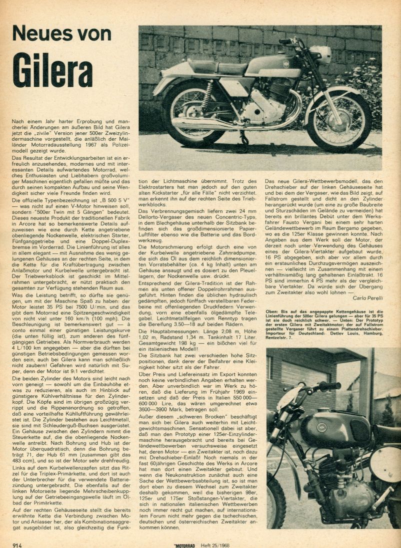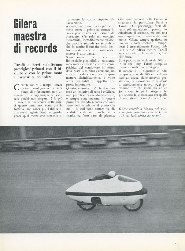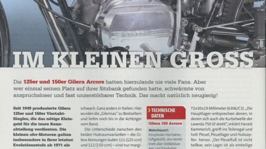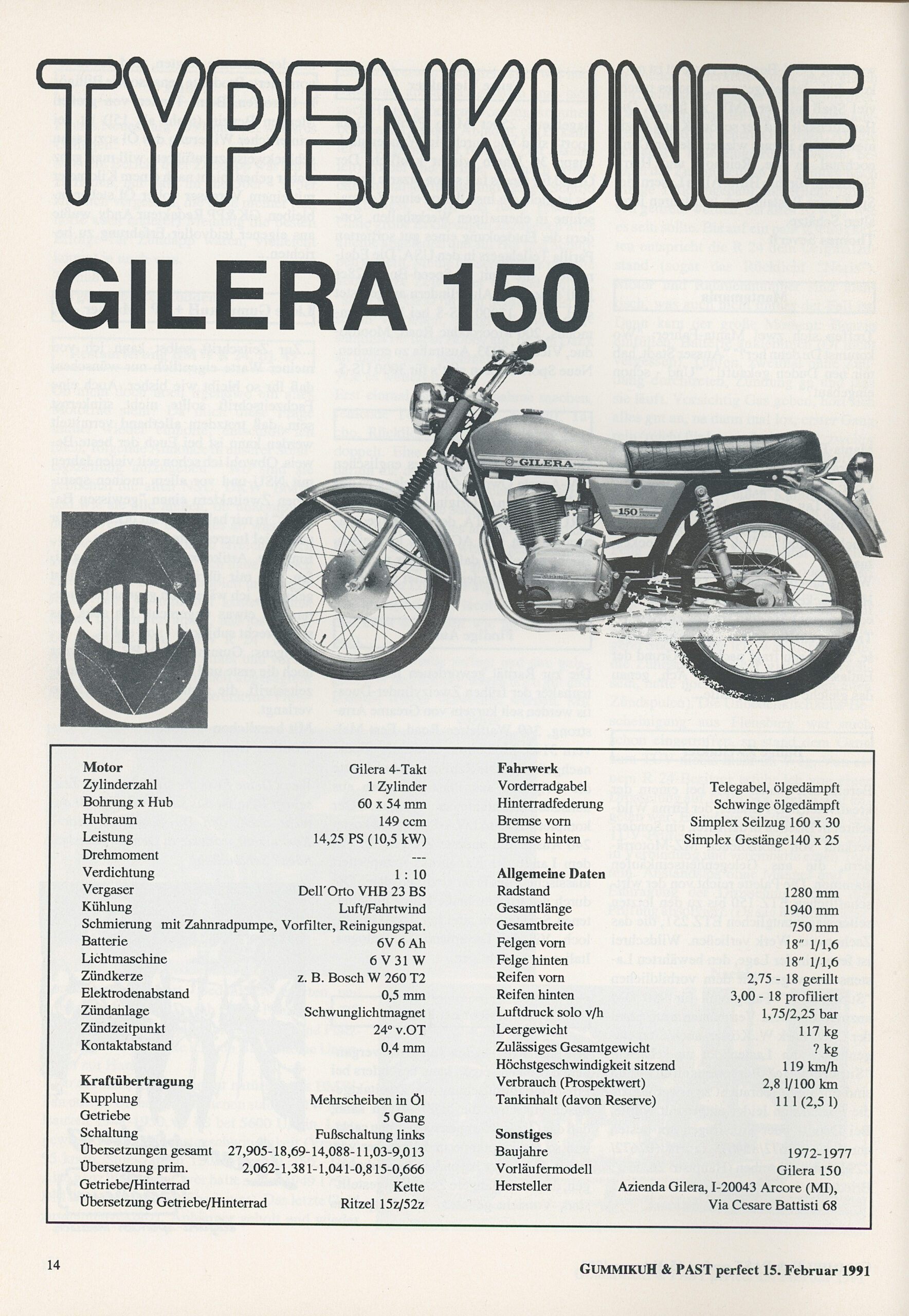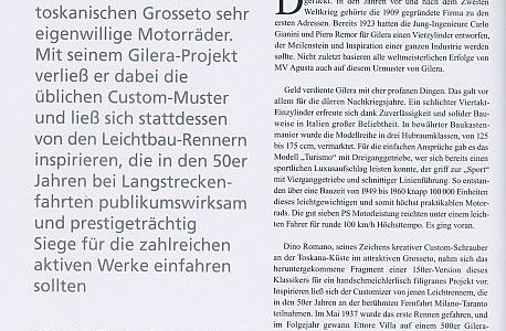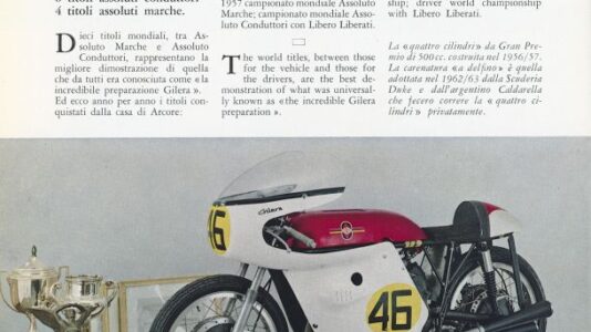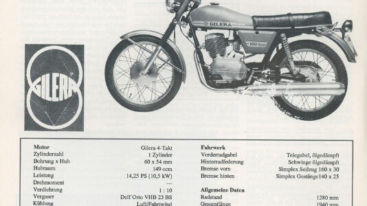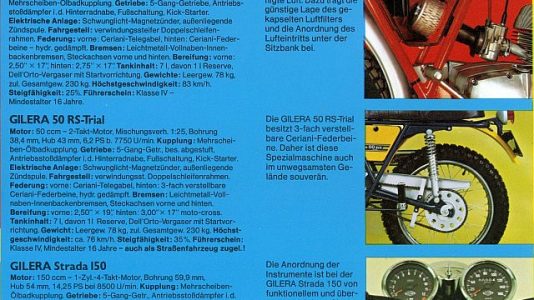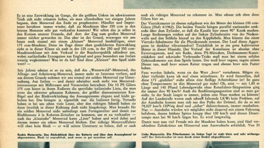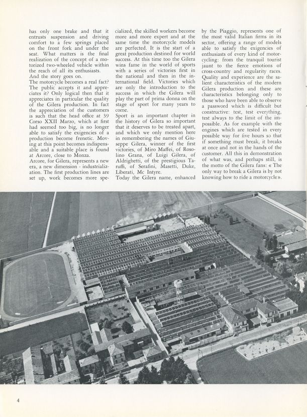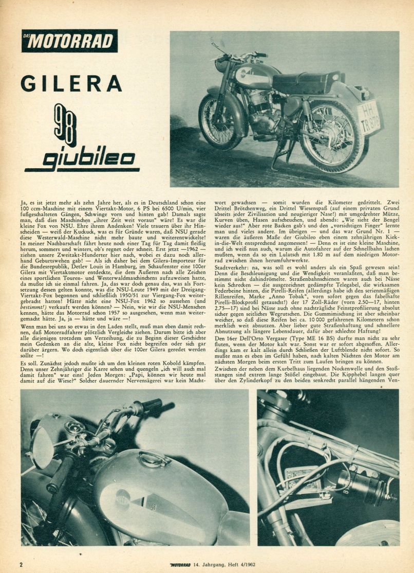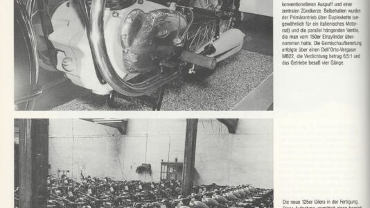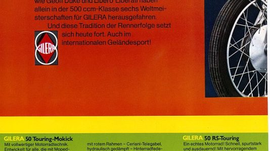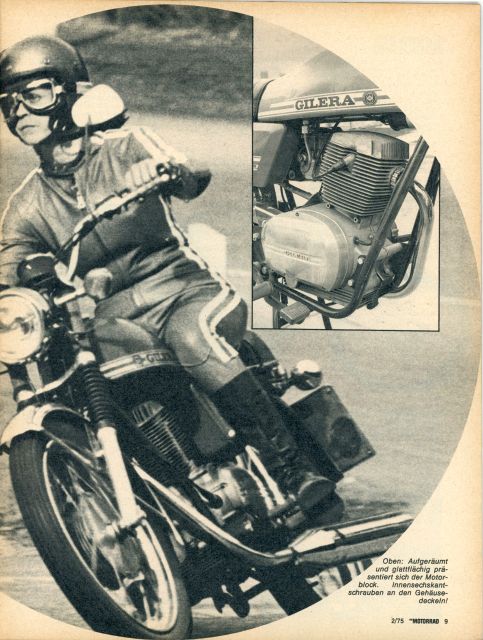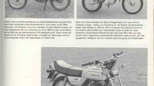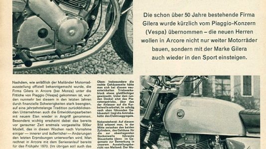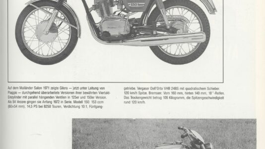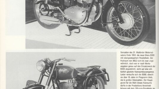 Presseschau III (1961 – BI4) - Seitenlayout überarbeitet 11.08.2024- Titelbild (Quelle: Internet) ------------------------------------------------------------------------------------- Bunte Mischung Gilera Werbung (Quelle: Internet) ------------------------------------------------------------------------------------- Piaggio/Gilera Broschüre 1969 (Quelle: Privatarchiv) ------------------------------------------------------------------------------------- Werbung Gilera 125 Zweitakt (Quelle: Internet) ------------------------------------------------------------------------------------- Werbung Gilera 200 Zweitakt (Quelle: Internet) ------------------------------------------------------------------------------------- Werbung Gilera 250 Zweitakt (Quelle: Internet) ------------------------------------------------------------------------------------- Datenblatt Gilera 125 XR2 Marathon (Quelle: Internet) ------------------------------------------------------------------------------------- Datenblatt Gilera 125 Top Rally (Quelle: Internet) ------------------------------------------------------------------------------------- Aus MOTALIA, Heft 250/2011 über die Gilera CX 125 (Quelle: Privatarchiv) ------------------------------------------------------------------------------------- Aus Gummikuh, Heft 1/1994 über die Gilera Arcore 150 (Quelle: Privatarchiv) ------------------------------------------------------------------------------------- Aus Gummikuh, Heft 2/1991 über die Gilera Arcore 150 (Quelle: Privatarchiv) ------------------------------------------------------------------------------------- Aus Oldtimer PRAXIS, Heft 5/2022 über den Motor einer Gilera Arcore (Quelle: Privatarchiv) ------------------------------------------------------------------------------------- Aus dem Buch Italienische Motorrad Klassiker Band 1 von Mick Walker über die Gilera Produktpalette (Quelle: Privatarchiv) ------------------------------------------------------------------------------------- Aus MOTOCICLISMO/Italien, Ausgabe ? über die Gilera Elmeca 125 Regolarita(Quelle: Internet) ------------------------------------------------------------------------------------- Aus Das MOTORRAD, Heft 7/1963 über Gilera wieder dabei (Quelle: Privatarchiv) ------------------------------------------------------------------------------------- Aus MOTO CICLISMO d´Epoca/Italien, Heft 11/2010 über die Gilera Giubileo 98 und 98 Extra(Quelle: Privatarchiv) ------------------------------------------------------------------------------------- Aus Moto revue/Frankreich, Heft 3001/1991 über die Gilera 125 CX(Quelle: Privatarchiv) ------------------------------------------------------------------------------------- Aus MOTO JOURNAL/Frankreich, Heft 872/1988 über einen 125 cc Vergleichstest u. a. mit der Gilera 125 RRT Nebraska (Quelle: Privatarchiv) ------------------------------------------------------------------------------------- Aus la vie de LA MOTO/Frankreich, Heft 779/2014 über die Gilera 124/5V Regolarita(Quelle: Privatarchiv) ------------------------------------------------------------------------------------- Aus la vie de LA MOTO/Frankreich, Heft 872/2016 über die Gilera 300 B(Quelle: Privatarchiv) ------------------------------------------------------------------------------------- Aus Moto Ciclismo d`Epoca/Italien, Heft 6/1997 über "Indimenticabili Gilera"(Quelle: Privatarchiv) ------------------------------------------------------------------------------------- Über die Gilera 175 R Competizione (Quelle: Internet) ------------------------------------------------------------------------------------- Aus Legend Bike/Italien, Heft 90/2000 über die Gilera 124 Regolarita Casa(Quelle: Privatarchiv) ------------------------------------------------------------------------------------- Aus MOTO CICLISMO/Italien, Heft 12/2002 über die Gilera 5V Arcore 125-150(Quelle: Privatarchiv) ------------------------------------------------------------------------------------- Aus MOTO JOURNAL/Frankreich, Heft 340/1977 über die Gilera 125 GR1(Quelle: Privatarchiv) ------------------------------------------------------------------------------------- Aus motosprint extra/Italien, Ausgabe 1987 über diverse Gilera 125(Quelle: Internet) ------------------------------------------------------------------------------------- Werbung über die Gilera C1 (Quelle: Internet) ------------------------------------------------------------------------------------- Werbung über die Gilera C2 (Quelle: Internet) ------------------------------------------------------------------------------------- Bericht über die Gilera E1 (Quelle: Internet) ------------------------------------------------------------------------------------- Gilera Prospekt über die 125 C2 bzw. E1 (Quelle: Internet) ------------------------------------------------------------------------------------- Bericht über die 125 cc Moto Cross Modelle (Quelle: Internet) ------------------------------------------------------------------------------------- Bericht über die ELMECA Gilera 125 Cross (Quelle: Internet) ------------------------------------------------------------------------------------- Aus Classic Bike/GB, Heft 153/1992 über eine Gilera 175 Rossa Extra(Quelle: Privatarchiv) ------------------------------------------------------------------------------------- Aus Classic Bike/GB, Heft 145/1992 über "The Saturno People"(Quelle: Privatarchiv) ------------------------------------------------------------------------------------- Aus Das MOTORRAD, Heft 11/1964 über das Gilera Gespann von Camathias (Quelle: Privatarchiv) ------------------------------------------------------------------------------------- Aus Das MOTORRAD, Heft 25/1968 über die neue 500er Gilera(Quelle: Privatarchiv) ------------------------------------------------------------------------------------- Gilera Prospekt über 50 Touring-Mokick, 50 RS-Touring, 50 RS-Trial und Strada 150(Quelle: Privatarchiv