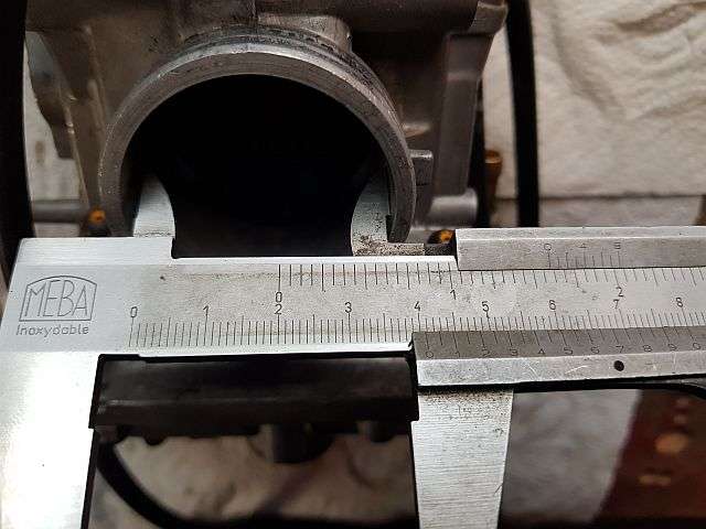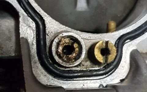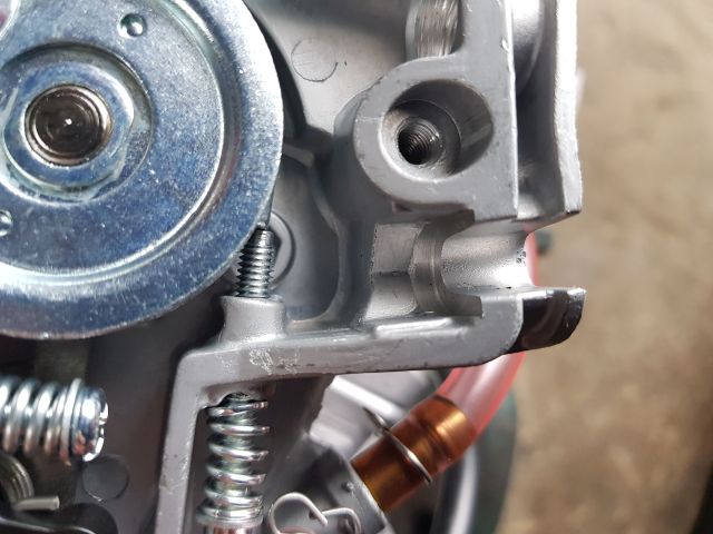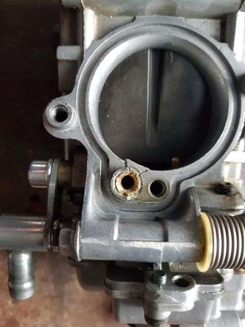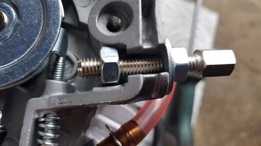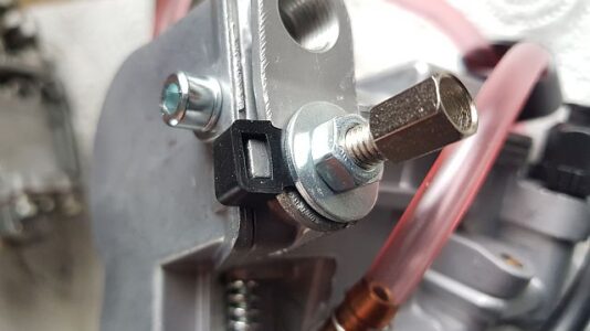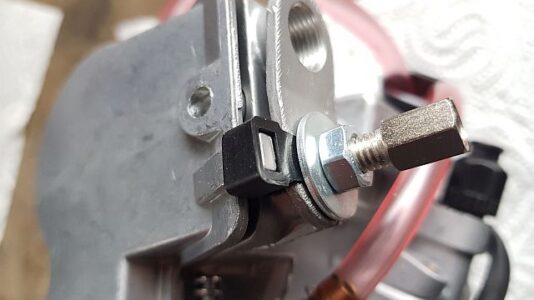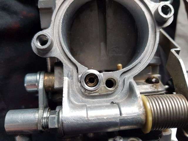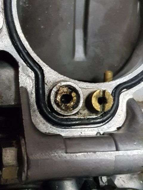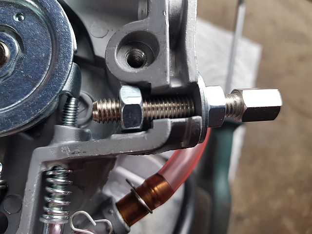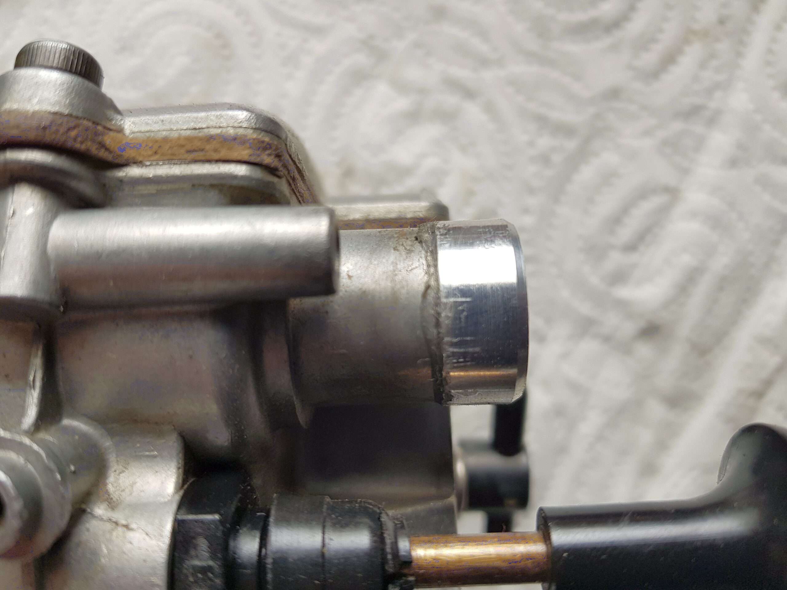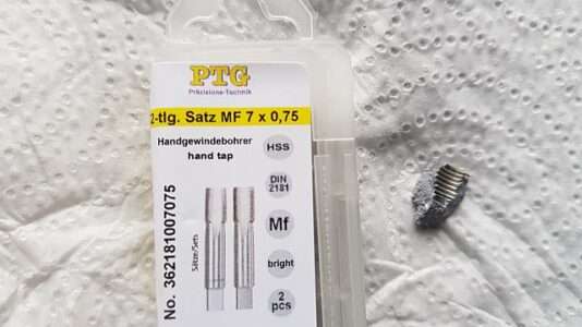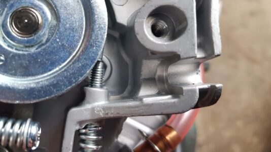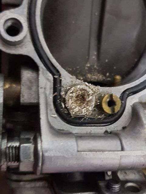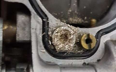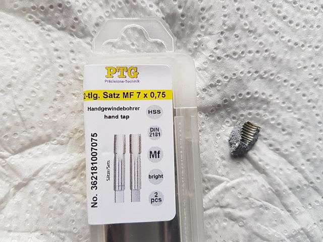 Hatte schon vor Jahren übers Internet ein nagelneues Dellorto PHM Vergasergehäuse erworben und wollte es komplettieren. Da hat sich doch tatsächlich herausgestellt, dass das Gewinde für die Leerlaufluftschraube nicht richtig gefertigt ist. Das Gewinde (M 7 x 0,75) sollte schon vorne am kleinen Absatz anfangen. Was tun? Ich werde versuchen, genau axial die Stelle auszubohren um eine Alubuchse mit Innengewinde einzukleben. Zentrieren kann ich die Buchse über das vorhandene Gewinde und einer langen Schraube.