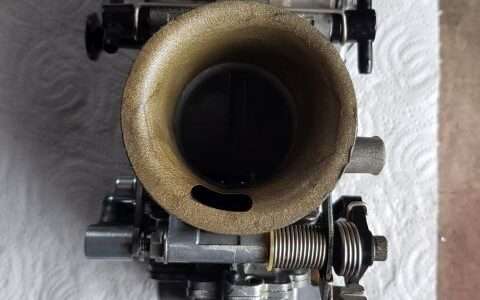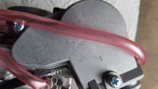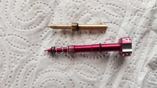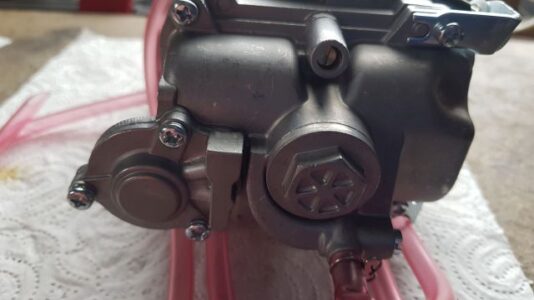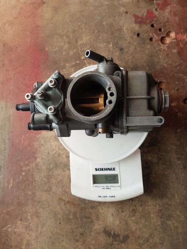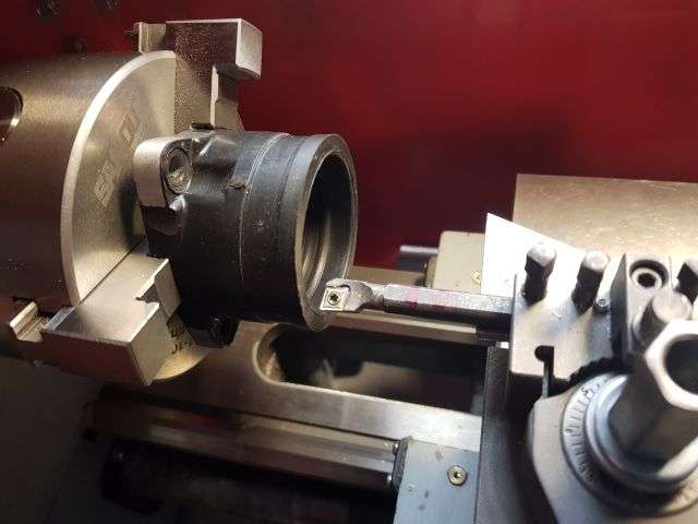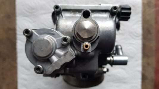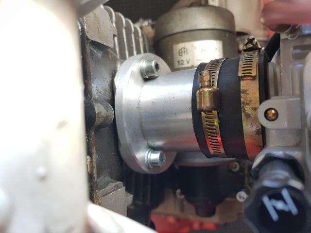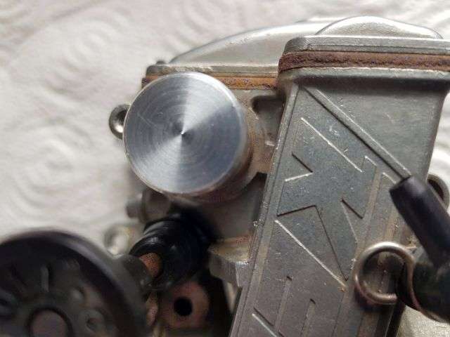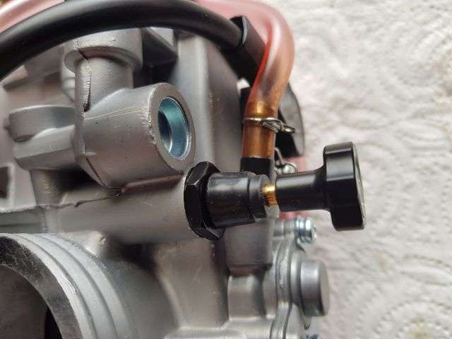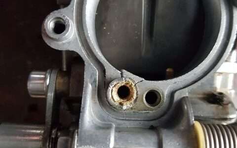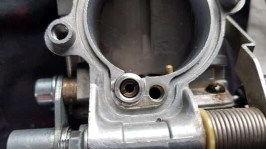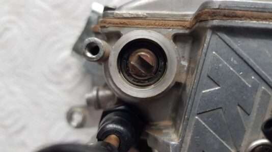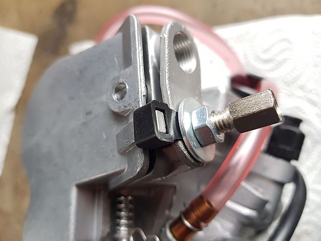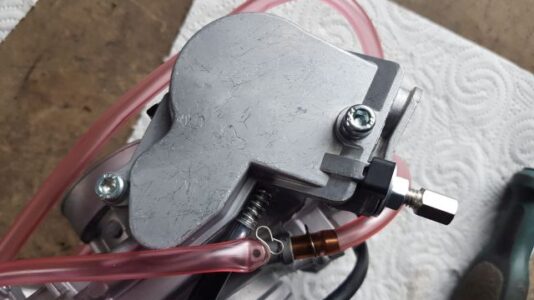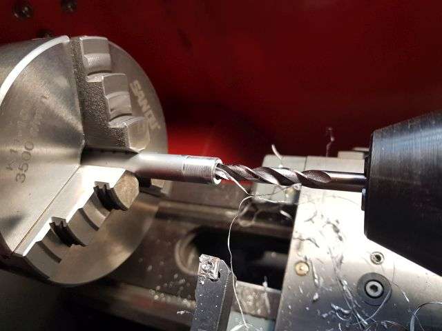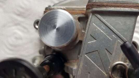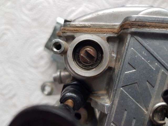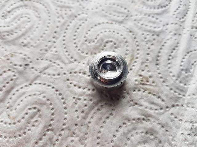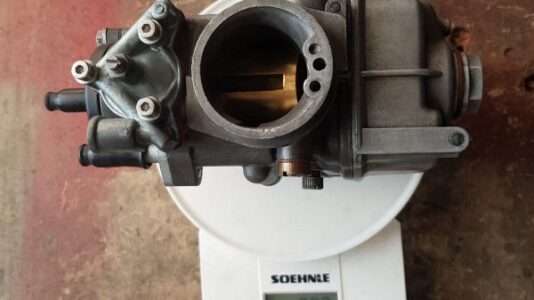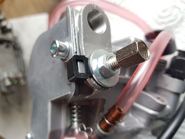 Hatte schon vor Jahren übers Internet ein nagelneues Dellorto PHM Vergasergehäuse erworben und wollte es komplettieren. Da hat sich doch tatsächlich herausgestellt, dass das Gewinde für die Leerlaufluftschraube nicht richtig gefertigt ist. Das Gewinde (M 7 x 0,75) sollte schon vorne am kleinen Absatz anfangen. Was tun? Ich werde versuchen, genau axial die Stelle auszubohren um eine Alubuchse mit Innengewinde einzukleben. Zentrieren kann ich die Buchse über das vorhandene Gewinde und einer langen Schraube.