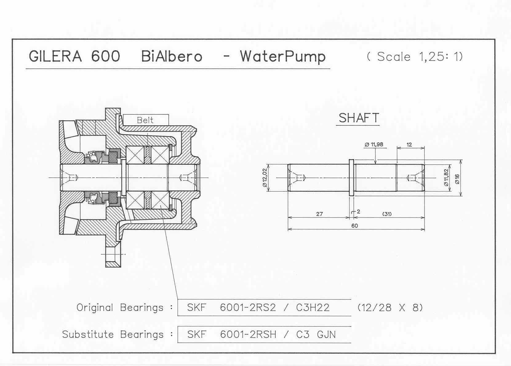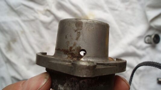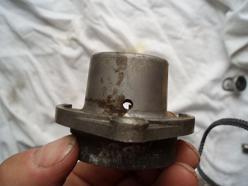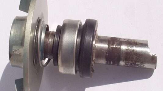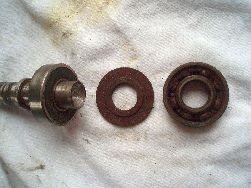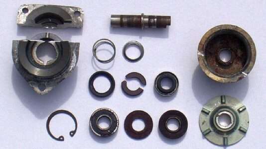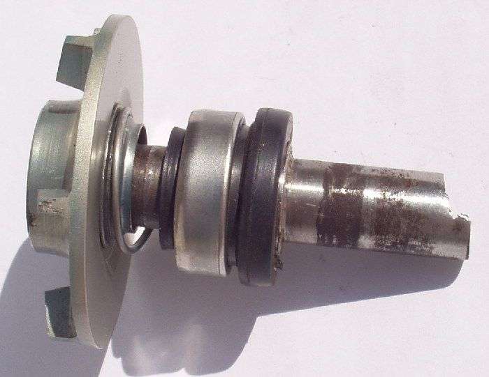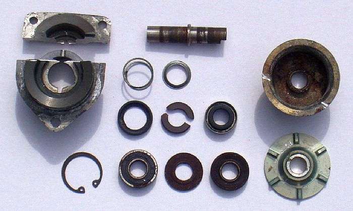 Auffällig war eine Verschraubung mit einem M6 Gewinde in der Welle auf der Seite der Antriebsrolle. Vermutlich eine mangelhafte Passung. In der Tat konnte man die Welle mit leicht erhöhter Handkraft herausdrücken. Vermutlich wurde die Pumpe schon mehrmals zerlegt. Eingebaut sind Z - Kugellager, ziemlich verölt, besser wären 2 RS Lager, original waren nur offene Lager verbaut. Die verbaute Gleitringdichtung hat keine Keramikreibflächen und sollte auch ausgetauscht werden. Schätzung der Kosten einer Überholung: GRD 35 €, 2 Lager 10 €, neue Welle anfertigen in Eigeninitiative 30 €.