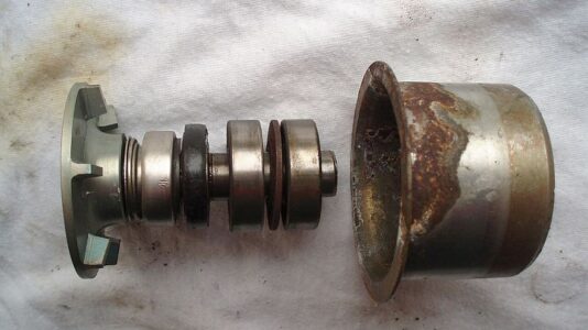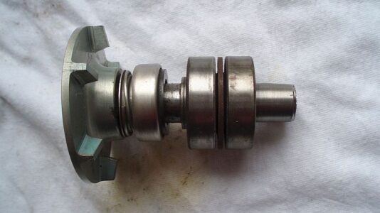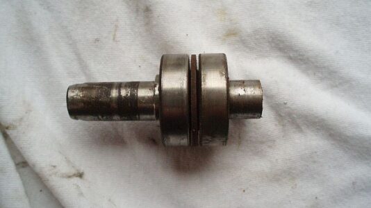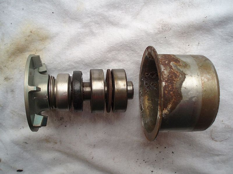Wichtig für das Zerlegen ist eine ordentliche Presse (sollte mindestens 2 t drücken, bitte keine Schraubstockexperimente), Ausdrückdorne und mindestens 2 passgenaue Hülsen (Drehbank erforderlich) für die Unterstützung von Flügelrad und Antriebsrolle beim Auspressen: