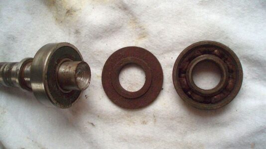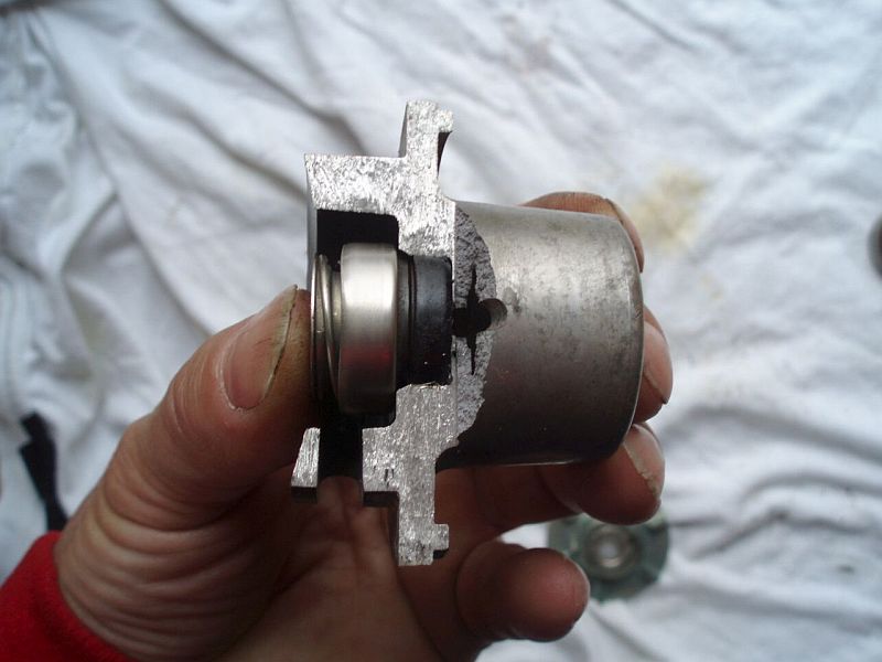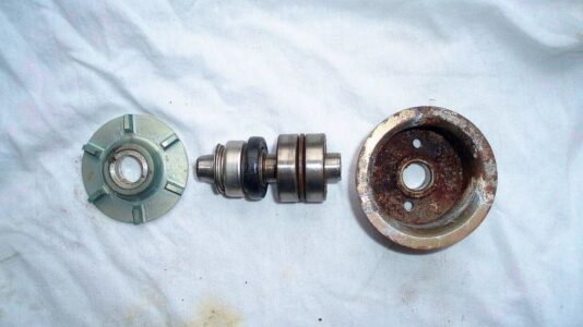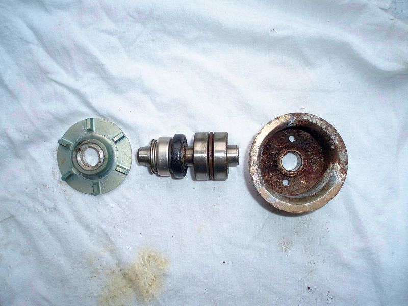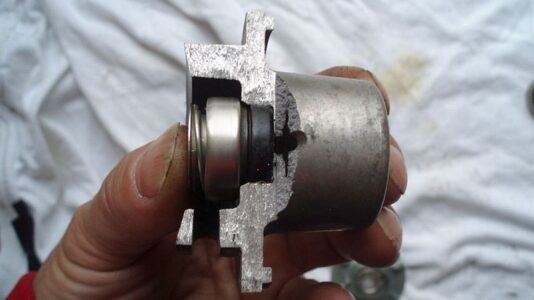 Ich beginne mit der Antriebsrolle. Warum? Die beiden kleinen Kugellager sind Pfennigartikel und sollten sowieso erneuert werden. Aber auf diese Weise bleibt die Achse mit Flügelrad und Gleitringdichtung als Einheit erhalten. Ich habe schon Pumpen zerlegt, da hatten die Lager etwas Spiel, möglicherweise durch eine zu stramme Einstellung des Zahnriemens. Der Rest dieser Pumpe war aber noch in Ordnung. Aber die Entscheidung, was erneuert werden sollte, muss individuell getroffen werden:
