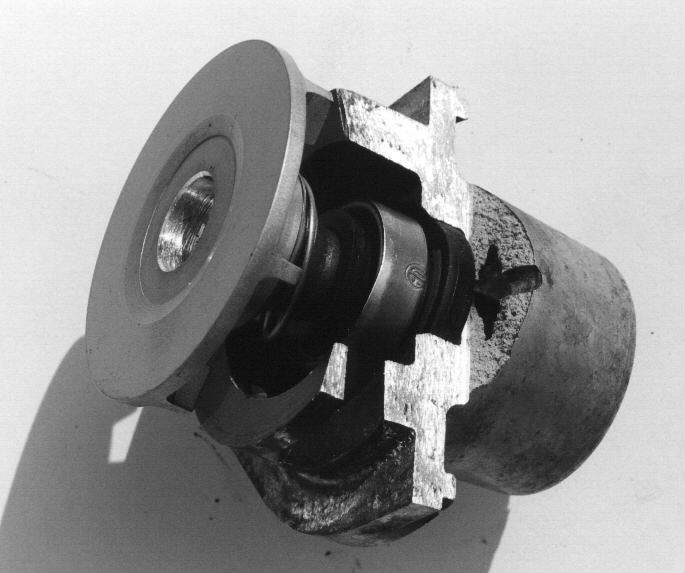Nicht schön, der Feinschliff fehlt, aber die Pumpe passt in die erweiterte Öffnung. Es verbleibt auch noch genügend Fläche der 45 Grad Kante für die Abdichtung mittel O-Ring. Eine Zylinderschleiferei bzw. mechanische Werkstatt kann das professioneller Auffräsen: