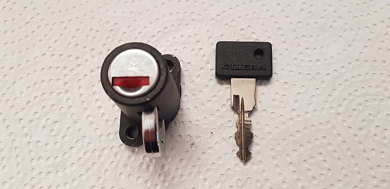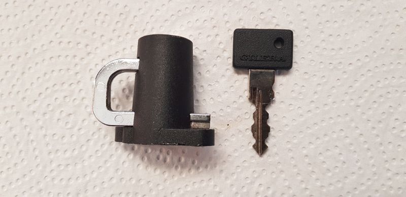 Ein neuwertiges ZADI Helmschloss mit einem Gilera Schlüssel. Leichte Kratzer auf der Chromblende. Baulänge 42 mm.