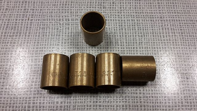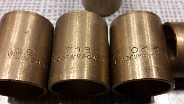 Fünf originale NSU Lagerbuchsen mit Längsnut, Einbauort unbekannt, mit Kennung E 713 011, Material Bögra-Bronze “PI”, L = 28 mm, D = 23 mm, Di = 19,90 mm, Preis pro Stück