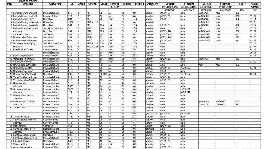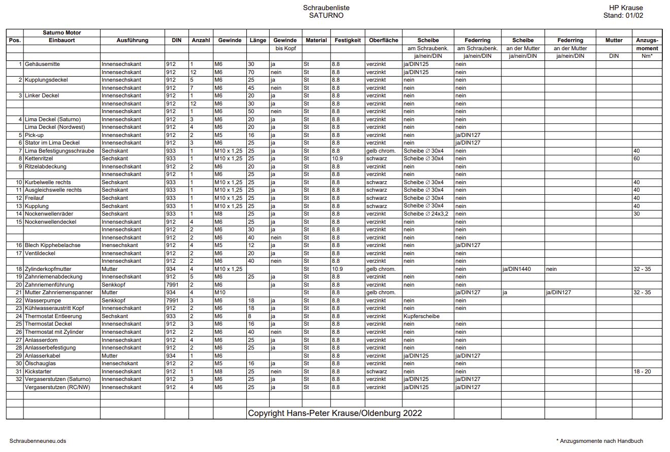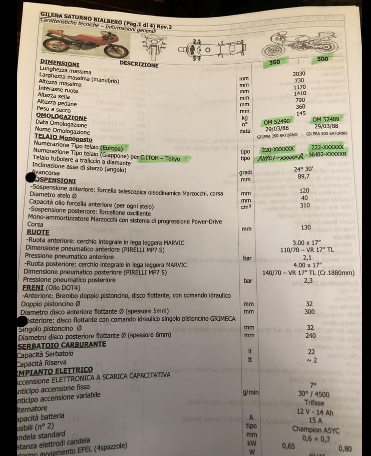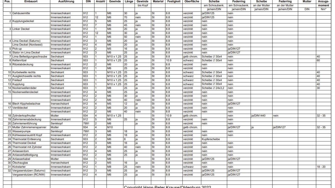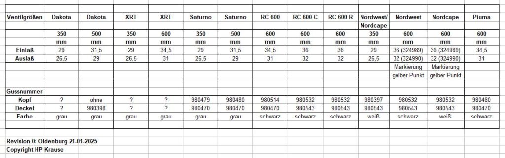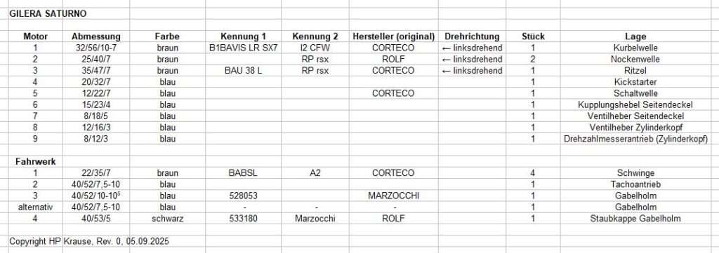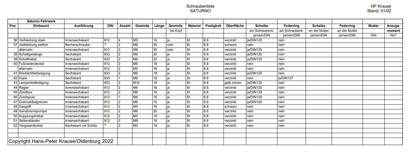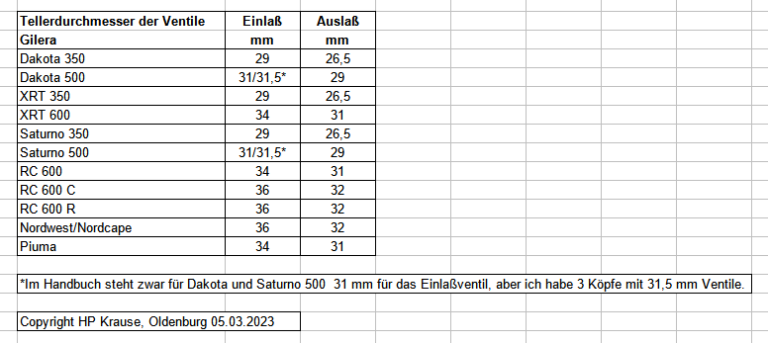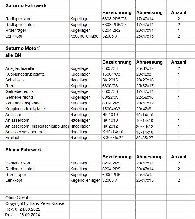 Tabellen etc. Seitenlayout überarbeitet 12.08.2024 ------------------------------------------------------------------------------------- GILERA SATURNO: Liste der Wellendichtringe ------------------------------------------------------------------------------------- BI4: Die mir bekannten Getriebeabstufungen (ohne Gewähr)(Quelle: Privatarchiv) ------------------------------------------------------------------------------------- BI4: Die mir bekannten Ventiltellerdurchmesser (ohne Gewähr)(Quelle: Privatarchiv) Neue Saturnoventile (Einlaß) mit 31,5 mm Tellerdurchmesser(Fotoquelle: Privat) ------------------------------------------------------------------------------------- BI4: Geometrie der mir derzeit bekannten Nockenwellen (ohne Gewähr)(Quelle: Privatarchiv) ------------------------------------------------------------------------------------- Saturno/Piuma/BI4: Lagerliste in Revision 1 (ohne Gewähr)(Quelle: Privatarchiv) ------------------------------------------------------------------------------------- Saturno: Schraubenliste (ohne Gewähr)(Quelle: Privatarchiv) ------------------------------------------------------------------------------------- Gilera Motorräder: Rahmenprefix Nummern (Quelle: Internet) ------------------------------------------------------------------------------------- Technisches Datenblatt Gilera Saturno 350, Rahmenprefix 220, Motorprefix 219 (Quelle: Facebook) ------------------------------------------------------------------------------------- Technisches Datenblatt mit der Zuordnung der Rahmenvornummern:Europa, Saturno 350 - 220Europa, Saturno 500 - 222Japan, Saturno 350 - NH01Japan, Saturno 500 - NH02(Quelle: Facebook) ------------------------------------------------------------------------------------- Homologationsblatt Saturno 350 (Quelle: Facebook) ------------------------------------------------------------------------------------- Homologationsblatt Saturno 500 (Quelle: Facebook) ------------------------------------------------------------------------------------- Bekanntmachung Saturno IOM 350/500 (Englisch)(Quelle: Facebook) ------------------------------------------------------------------------------------- Bekanntmachung Saturno IOM 350/500 (Japanisch)(Quelle: Facebook) -------------------------------------------------------------------------------------